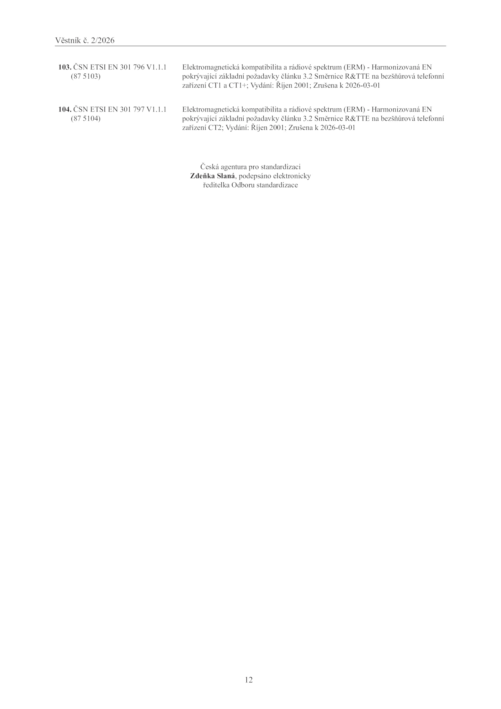 2 Směrnice R&TTE bezšňůrová telefonní zařízení CT2; Vydání: Říjen 2001; Zrušena 2026-03-01 Česká agentura pro standardizaci Zdeňka Slaná, podepsáno elektronicky ředitelka Odboru standardizace .1. ČSN ETSI 301 797 V1.Věstník 2/2026 12 103. ČSN ETSI 301 796 V1.1 (87 5104) Elektromagnetická kompatibilita rádiové spektrum (ERM) Harmonizovaná EN pokrývající základní požadavky článku 3.2 Směrnice R&TTE bezšňůrová telefonní zařízení CT1 CT1+; Vydání: Říjen 2001; Zrušena 2026-03-01 104.1.1 (87 5103) Elektromagnetická kompatibilita rádiové spektrum (ERM) Harmonizovaná EN pokrývající základní požadavky článku 3