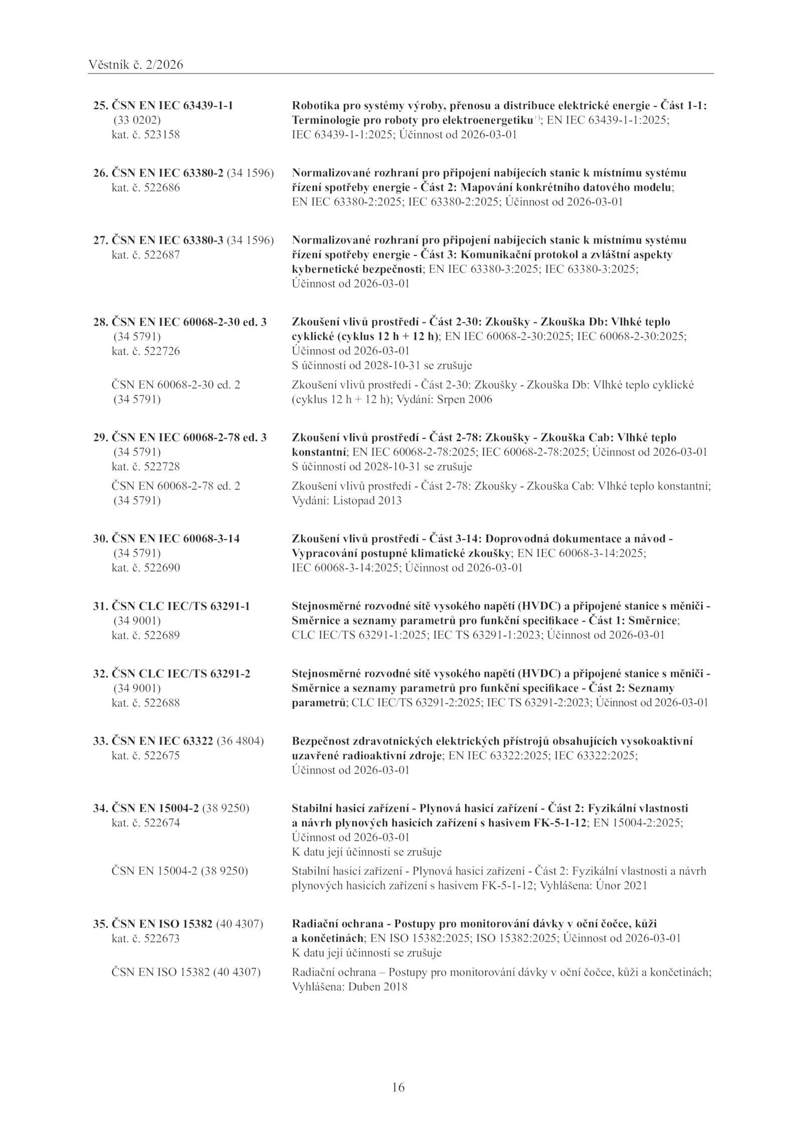ČSN IEC 63322 (36 4804) kat. ČSN 15004-2 (38 9250) kat. 3 (34 5791) kat. ČSN ISO 15382 (40 4307) kat. 522688 Stejnosměrné rozvodné sítě vysokého napětí (HVDC) připojené stanice měniči - Směrnice seznamy parametrů pro funkční specifikace Část Seznamy parametrů; CLC IEC/TS 63291-2:2025; IEC 63291-2:2023; Účinnost 2026-03-01 33. 522687 Normalizované rozhraní pro připojení nabíjecích stanic místnímu systému řízení spotřeby energie Část Komunikační protokol zvláštní aspekty kybernetické bezpečnosti; IEC 63380-3:2025; IEC 63380-3:2025; Účinnost 2026-03-01 28. ČSN CLC IEC/TS 63291-1 (34 9001) kat. ČSN IEC 60068-2-78 ed. 522726 Zkoušení vlivů prostředí Část 2-30: Zkoušky Zkouška Db: Vlhké teplo cyklické (cyklus h); IEC 60068-2-30:2025; IEC 60068-2-30:2025; Účinnost 2026-03-01 S účinností 2028-10-31 zrušuje ČSN 60068-2-30 ed. 522686 Normalizované rozhraní pro připojení nabíjecích stanic místnímu systému řízení spotřeby energie Část Mapování konkrétního datového modelu; EN IEC 63380-2:2025; IEC 63380-2:2025; Účinnost 2026-03-01 27. 522675 Bezpečnost zdravotnických elektrických přístrojů obsahujících vysokoaktivní uzavřené radioaktivní zdroje; IEC 63322:2025; IEC 63322:2025; Účinnost 2026-03-01 34. 2 (34 5791) Zkoušení vlivů prostředí Část 2-30: Zkoušky Zkouška Db: Vlhké teplo cyklické (cyklus h); Vydání: Srpen 2006 29. ČSN IEC 60068-3-14 (34 5791) kat. 522690 Zkoušení vlivů prostředí Část 3-14: Doprovodná dokumentace návod - Vypracování postupné klimatické zkoušky; IEC 60068-3-14:2025; IEC 60068-3-14:2025; Účinnost 2026-03-01 31. ČSN IEC 63380-3 (34 1596) kat. ČSN IEC 63380-2 (34 1596) kat. 522728 Zkoušení vlivů prostředí Část 2-78: Zkoušky Zkouška Cab: Vlhké teplo konstantní; IEC 60068-2-78:2025; IEC 60068-2-78:2025; Účinnost 2026-03-01 S účinností 2028-10-31 zrušuje ČSN 60068-2-78 ed. ČSN IEC 60068-2-30 ed. 522674 Stabilní hasicí zařízení Plynová hasicí zařízení Část Fyzikální vlastnosti a návrh plynových hasicích zařízení hasivem FK-5-1-12; 15004-2:2025; Účinnost 2026-03-01 K datu její účinnosti zrušuje ČSN 15004-2 (38 9250) Stabilní hasicí zařízení Plynová hasicí zařízení Část Fyzikální vlastnosti návrh plynových hasicích zařízení hasivem FK-5-1-12; Vyhlášena: Únor 2021 35. 522689 Stejnosměrné rozvodné sítě vysokého napětí (HVDC) připojené stanice měniči - Směrnice seznamy parametrů pro funkční specifikace Část Směrnice; CLC IEC/TS 63291-1:2025; IEC 63291-1:2023; Účinnost 2026-03-01 32. ČSN IEC 63439-1-1 (33 0202) kat. 522673 Radiační ochrana Postupy pro monitorování dávky oční čočce, kůži a končetinách; ISO 15382:2025; ISO 15382:2025; Účinnost 2026-03-01 K datu její účinnosti zrušuje ČSN ISO 15382 (40 4307) Radiační ochrana Postupy pro monitorování dávky oční čočce, kůži končetinách; Vyhlášena: Duben 2018 . 523158 Robotika pro systémy výroby, přenosu distribuce elektrické energie Část 1-1: Terminologie pro roboty pro elektroenergetiku+) ; IEC 63439-1-1:2025; IEC 63439-1-1:2025; Účinnost 2026-03-01 26. 3 (34 5791) kat. ČSN CLC IEC/TS 63291-2 (34 9001) kat.Věstník 2/2026 16 25. 2 (34 5791) Zkoušení vlivů prostředí Část 2-78: Zkoušky Zkouška Cab: Vlhké teplo konstantní; Vydání: Listopad 2013 30