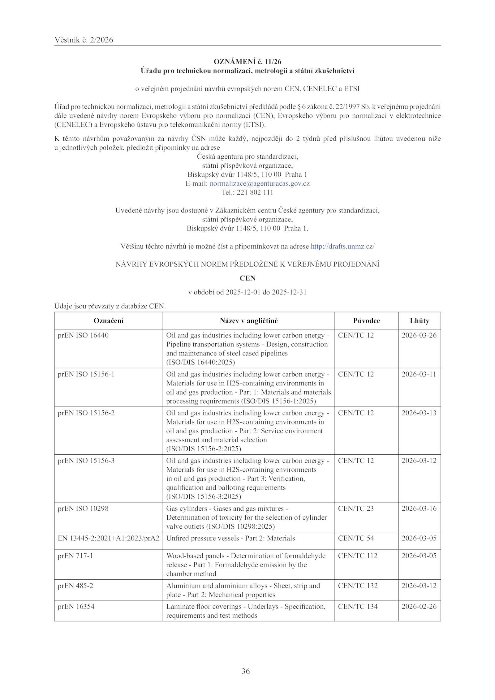 Údaje jsou převzaty databáze CEN.Věstník 2/2026