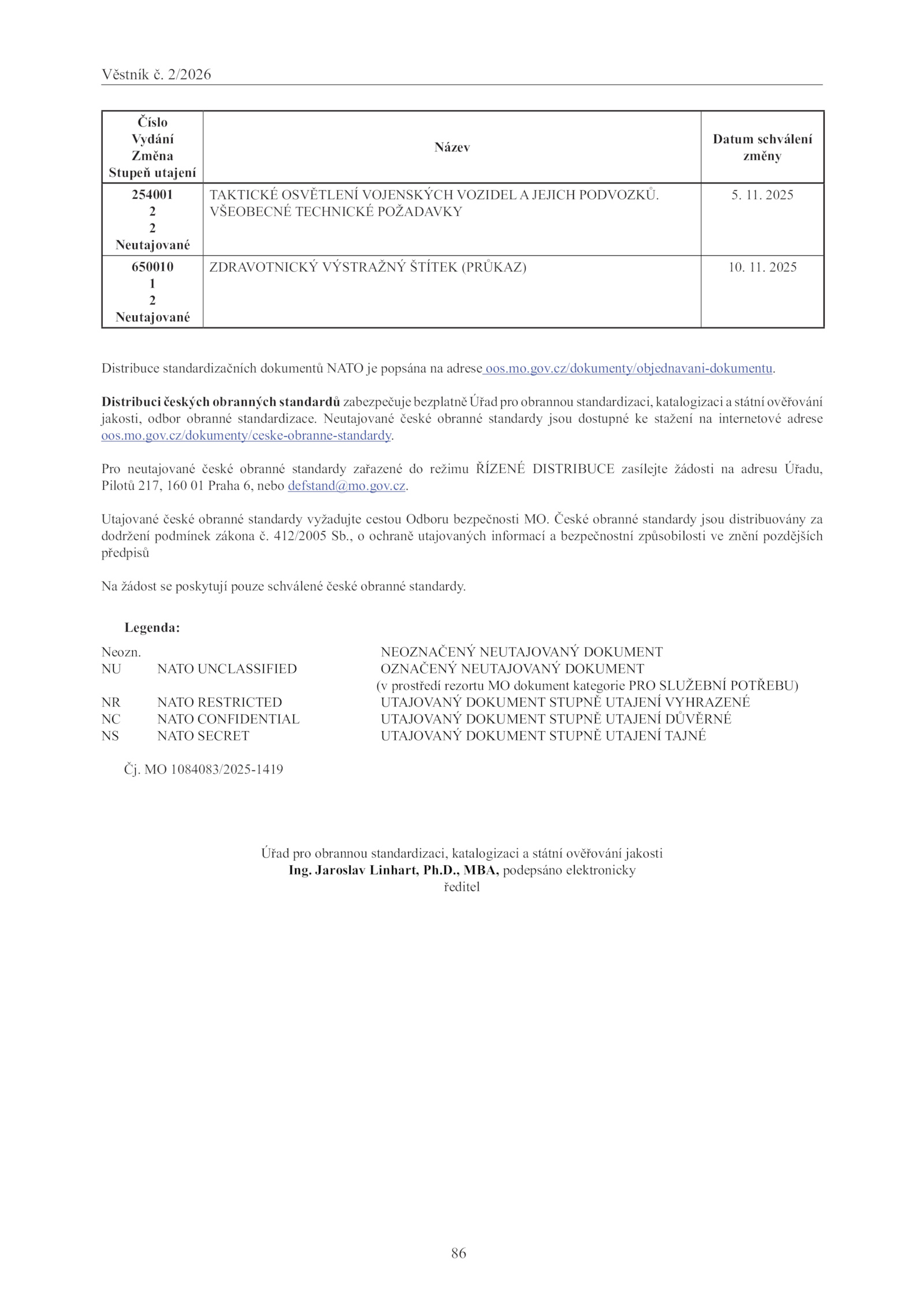 Distribuce standardizačních dokumentů NATO popsána adrese oos.mo. Jaroslav Linhart, Ph., MBA, podepsáno elektronicky