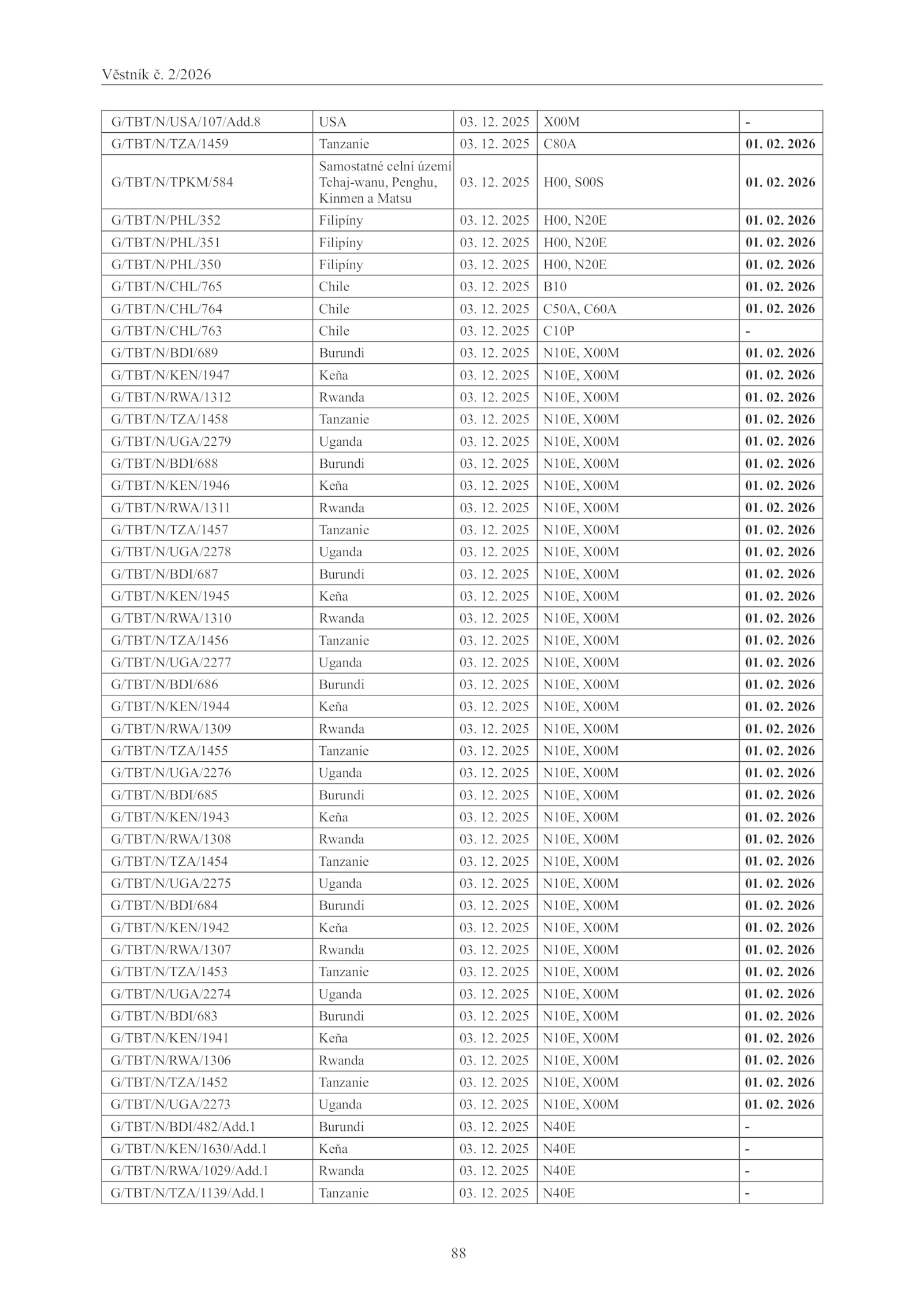 G/TBT/N/TZA/1452 Tanzanie 03. 02. 02. 12. 2025 N10E, X00M 01. 2025 N10E, X00M 01. 2026
