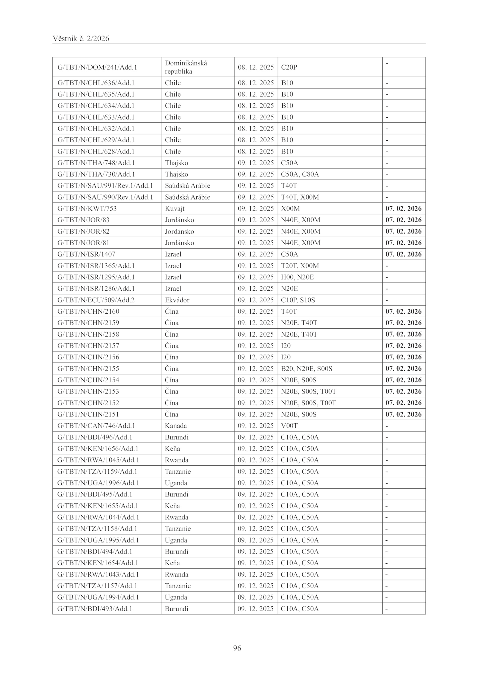 G/TBT/N/CHN/2153 Čína 09. 12. 12.1 Keňa 09.1 Rwanda 09.Věstník 2/2026