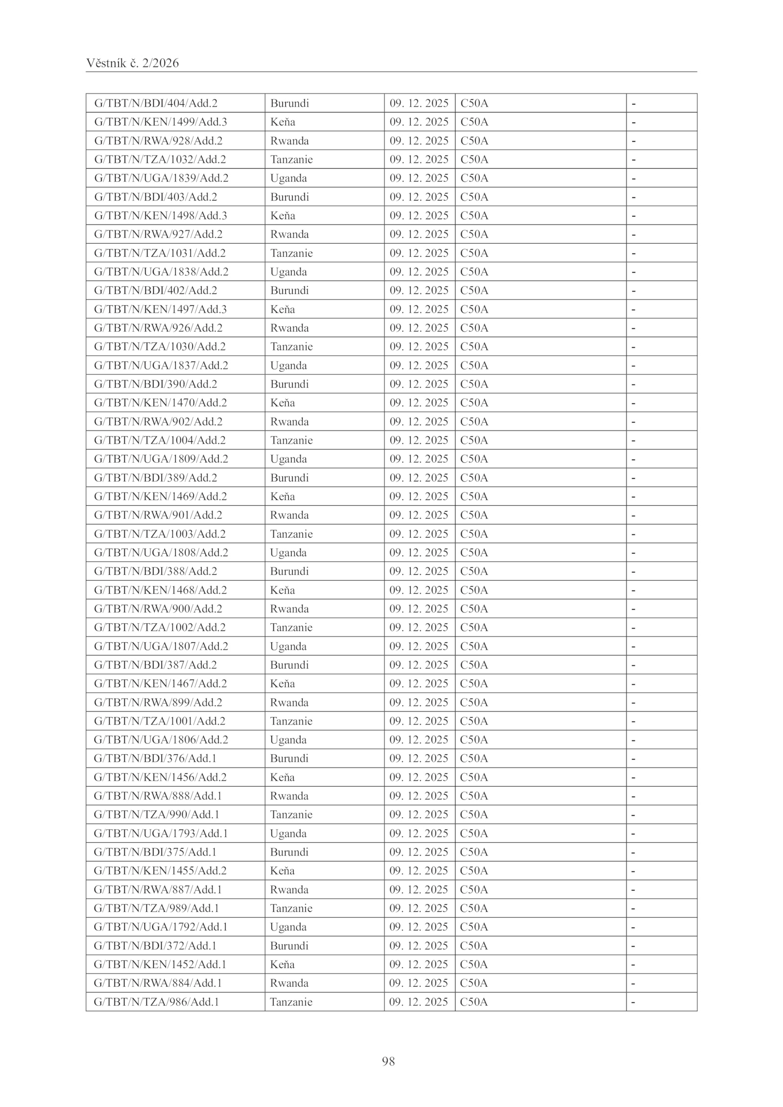 12. 12.1 Rwanda 09.2 Uganda 09. 2025 C50A - G/TBT/N/KEN/1499/Add.2 Uganda 09.2 Burundi 09. 12.2 Rwanda 09.2 Keňa 09.2 Rwanda 09. 2025 C50A - G/TBT/N/KEN/1497/Add. 12.2 Burundi 09.2 Rwanda 09. 12. 12. 12. 12. 12.1 Rwanda 09. 12. 2025 C50A - G/TBT/N/TZA/1031/Add.3 Keňa 09.2 Rwanda 09.1 Rwanda 09.Věstník 2/2026 98 G/TBT/N/BDI/404/Add. 2025 C50A - G/TBT/N/UGA/1793/Add. 2025 C50A - G/TBT/N/KEN/1468/Add.2 Burundi 09.1 Burundi 09. 2025 C50A - G/TBT/N/BDI/388/Add. 12. 2025 C50A - G/TBT/N/BDI/375/Add.2 Burundi 09. 12. 2025 C50A - G/TBT/N/UGA/1838/Add. 2025 C50A - G/TBT/N/TZA/1030/Add.3 Keňa 09. 12.2 Keňa 09.1 Tanzanie 09. 2025 C50A - G/TBT/N/BDI/387/Add.2 Rwanda 09. 2025 C50A - G/TBT/N/TZA/1004/Add. 2025 C50A - G/TBT/N/RWA/887/Add.1 Tanzanie 09. 2025 C50A - G/TBT/N/TZA/990/Add. 2025 C50A - G/TBT/N/KEN/1469/Add. 12. 2025 C50A - G/TBT/N/KEN/1455/Add.3 Keňa 09.1 Uganda 09. 2025 C50A - G/TBT/N/RWA/928/Add. 12. 2025 C50A - G/TBT/N/RWA/927/Add. 2025 C50A - G/TBT/N/BDI/403/Add. 2025 C50A - G/TBT/N/BDI/389/Add. 12. 2025 C50A - G/TBT/N/TZA/989/Add. 2025 C50A - G/TBT/N/RWA/926/Add. 2025 C50A - G/TBT/N/RWA/902/Add. 2025 C50A - G/TBT/N/UGA/1837/Add.2 Tanzanie 09. 2025 C50A - G/TBT/N/RWA/901/Add.2 Uganda 09. 2025 C50A - G/TBT/N/TZA/1002/Add. 2025 C50A - G/TBT/N/UGA/1809/Add. 2025 C50A - G/TBT/N/BDI/390/Add. 12.2 Uganda 09. 12.2 Tanzanie 09. 2025 C50A - G/TBT/N/KEN/1456/Add. 2025 C50A - G/TBT/N/UGA/1792/Add. 2025 C50A - G/TBT/N/TZA/986/Add. 12. 12. 2025 C50A - G/TBT/N/TZA/1001/Add. 12. 12.2 Keňa 09. 12.2 Burundi 09.2 Uganda 09.2 Keňa 09. 12.1 Burundi 09. 2025 C50A - G/TBT/N/RWA/899/Add. 12. 2025 C50A - G/TBT/N/UGA/1806/Add. 12.1 Tanzanie 09. 2025 C50A. 12. 12. 2025 C50A - G/TBT/N/UGA/1808/Add. 2025 C50A - G/TBT/N/KEN/1452/Add.2 Burundi 09. 12. 12. 12. 2025 C50A - G/TBT/N/BDI/402/Add. 2025 C50A - G/TBT/N/KEN/1498/Add. 2025 C50A - G/TBT/N/RWA/888/Add.2 Uganda 09. 12. 2025 C50A - G/TBT/N/BDI/372/Add. 2025 C50A - G/TBT/N/TZA/1003/Add. 2025 C50A - G/TBT/N/KEN/1467/Add. 12. 2025 C50A - G/TBT/N/KEN/1470/Add.2 Tanzanie 09. 2025 C50A - G/TBT/N/RWA/900/Add. 12.1 Uganda 09. 2025 C50A - G/TBT/N/BDI/376/Add. 12.2 Tanzanie 09. 12.1 Burundi 09. 12.2 Rwanda 09. 12. 12. 12. 2025 C50A - G/TBT/N/UGA/1839/Add. 12. 2025 C50A - G/TBT/N/TZA/1032/Add.2 Keňa 09. 12. 12.2 Tanzanie 09.2 Rwanda 09.2 Keňa 09.1 Keňa 09.2 Burundi 09. 12. 12. 12.2 Tanzanie 09. 12.2 Uganda 09. 12. 12. 2025 C50A - G/TBT/N/RWA/884/Add. 2025 C50A - G/TBT/N/UGA/1807/Add.2 Tanzanie 09