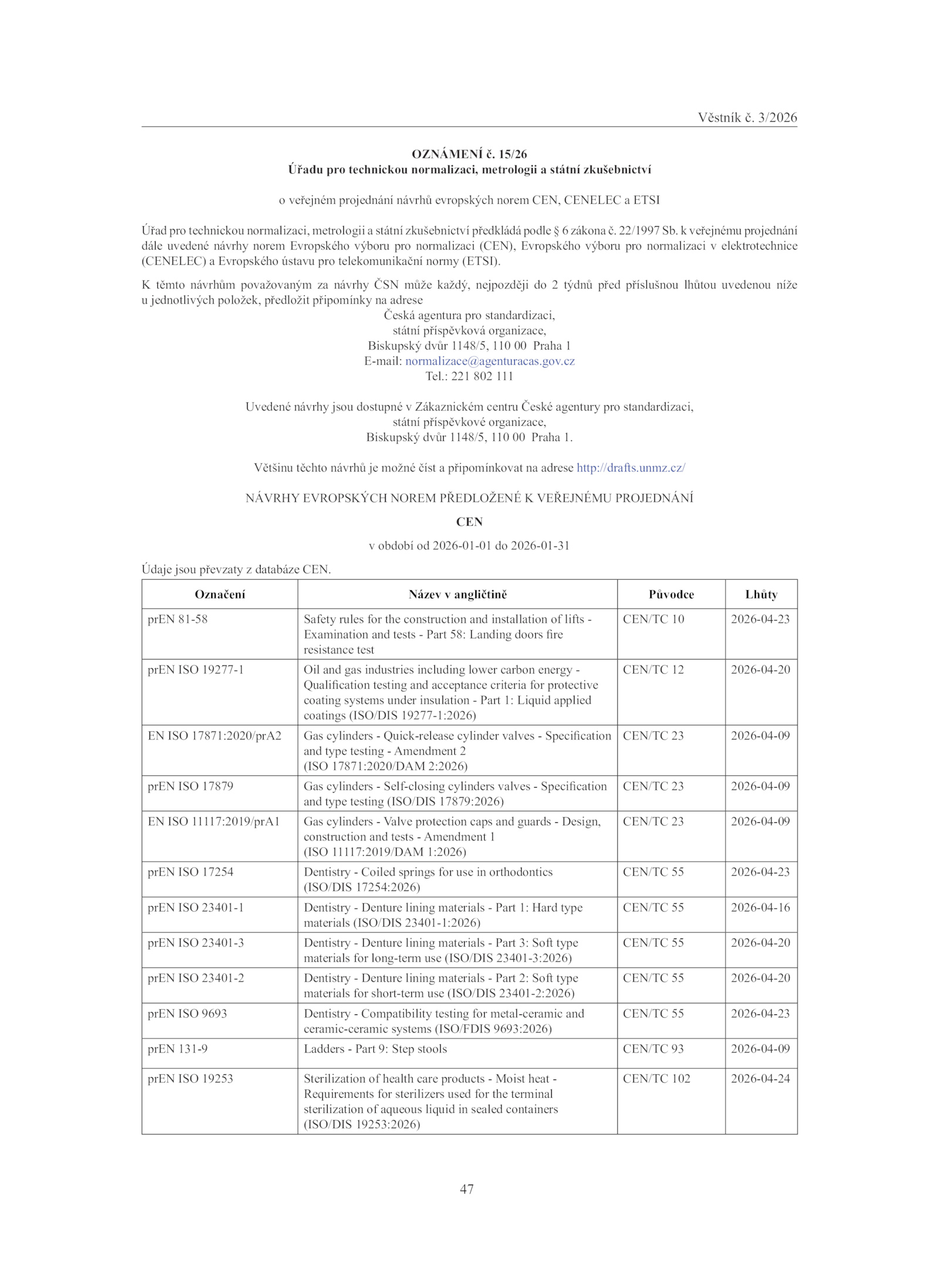 Uvedené návrhy jsou dostupné Zákaznickém centru České agentury pro standardizaci,
