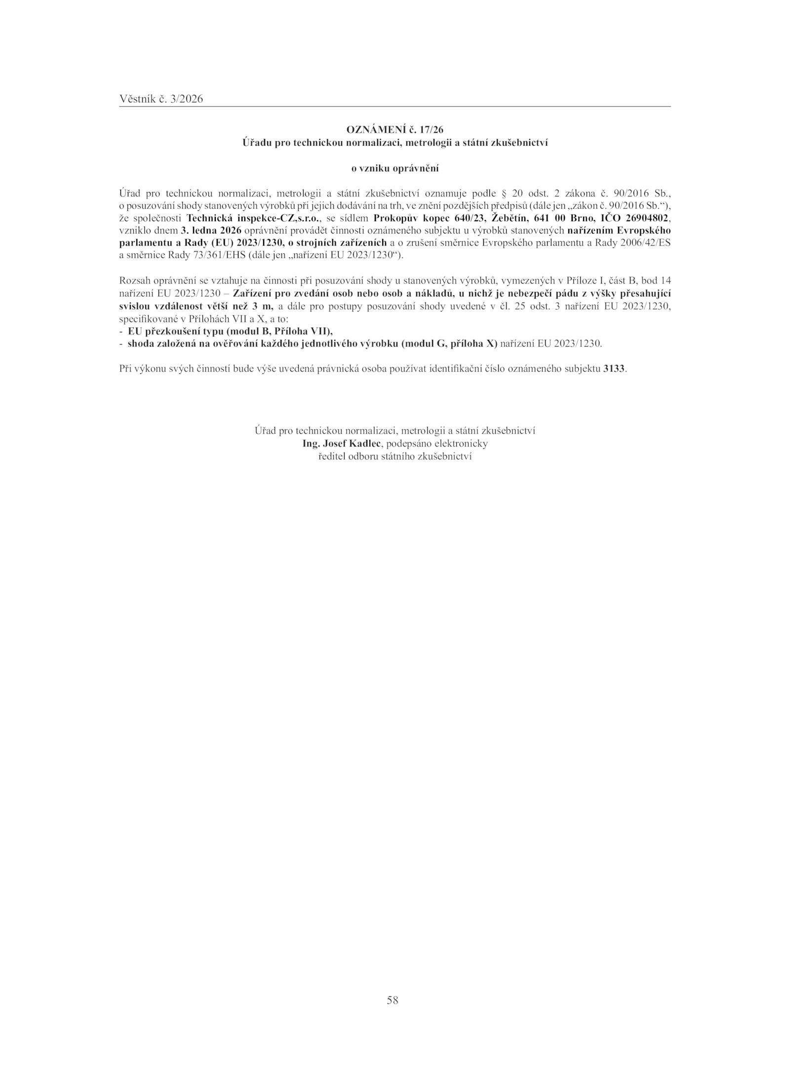 Úřad pro technickou normalizaci, metrologii státní zkušebnictví oznamuje podle odst. Josef Kadlec, podepsáno elektronicky