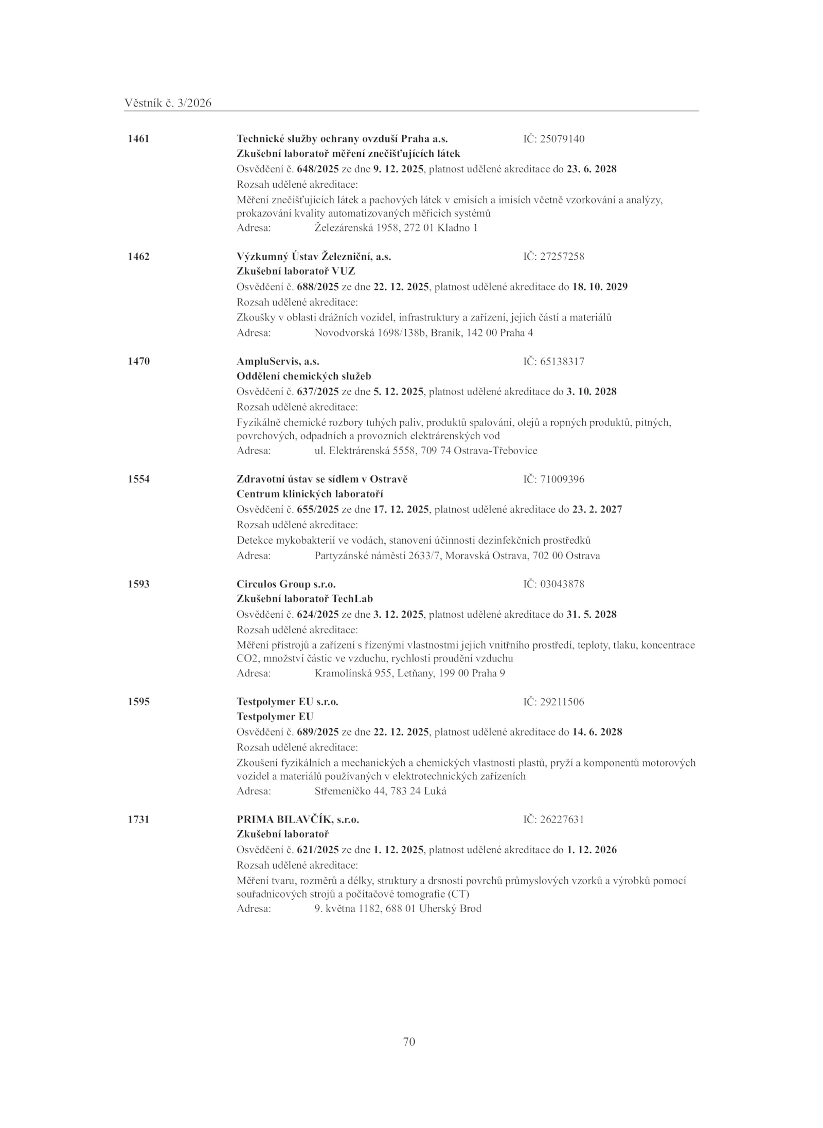 Věstník 3-26. 2025, platnost udělené akreditace 31.o. 2029