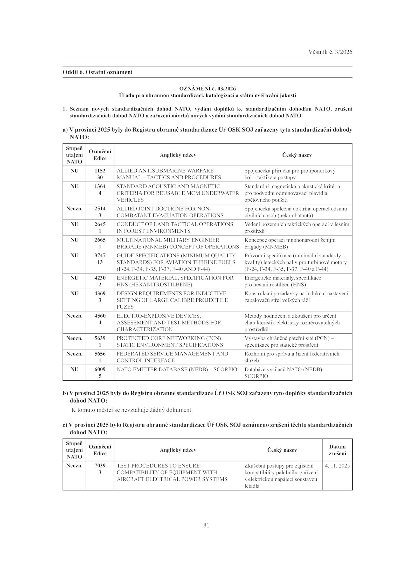 c) prosinci 2025 bylo Registru obranné standardizace OSK SOJ oznámeno zrušení těchto standardizačních