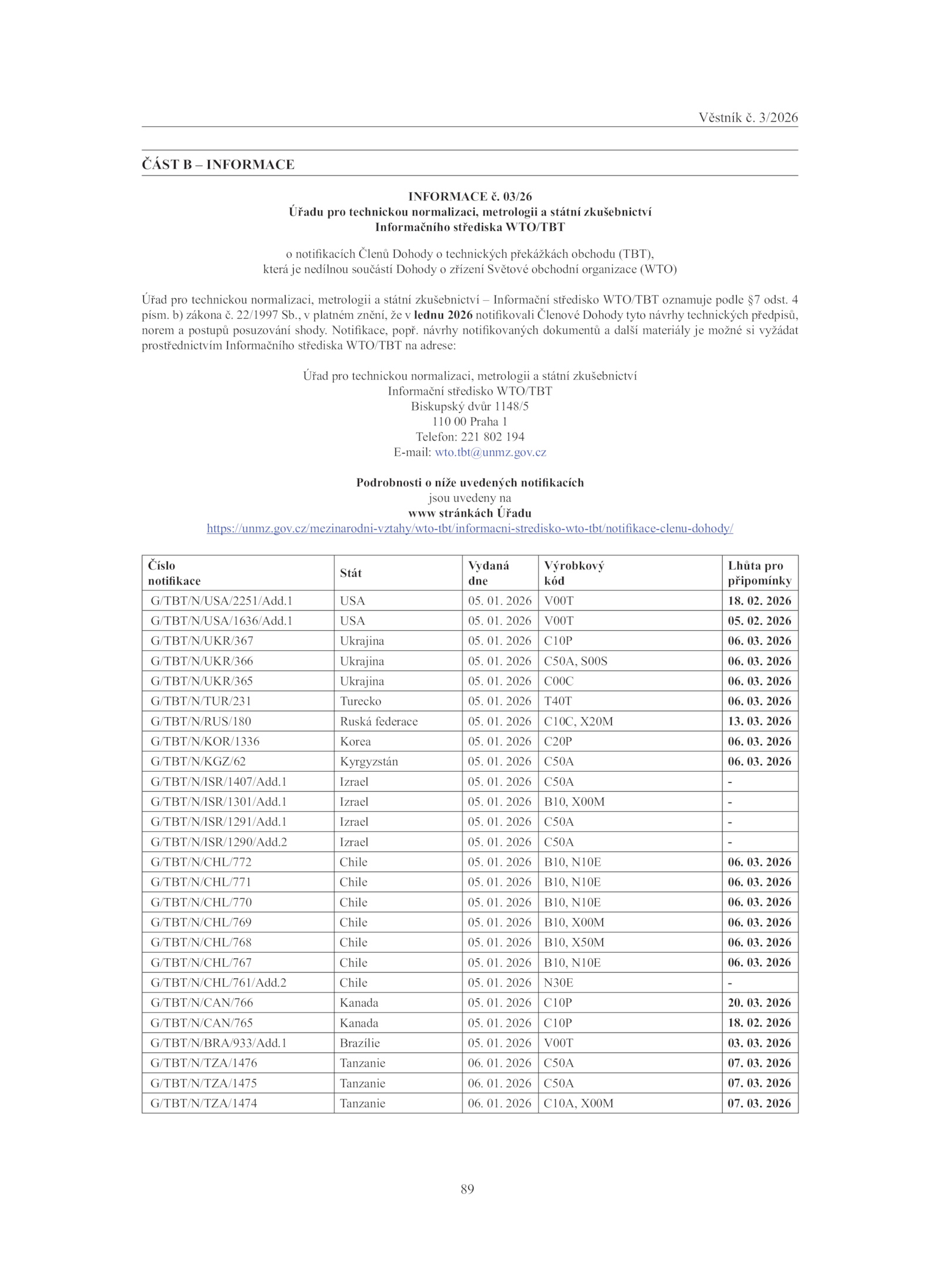 Úřad pro technickou normalizaci, metrologii státní zkušebnictví Informační středisko WTO/TBT oznamuje podle odst. 03. 2026 B10, N10E 06. 2026