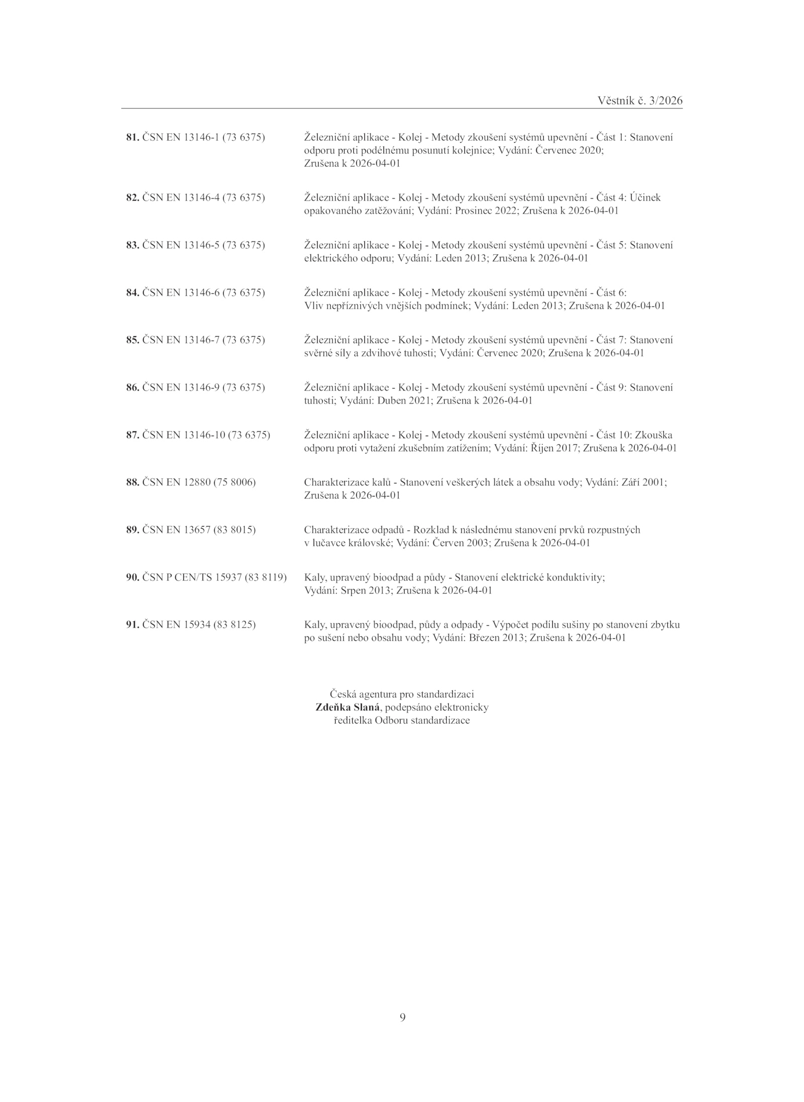 2026 10:37:03 . ČSN 13146-5 (73 6375) Železniční aplikace Kolej Metody zkoušení systémů upevnění Část Stanovení elektrického odporu; Vydání: Leden 2013; Zrušena 2026-04-01 84. ČSN 13146-10 (73 6375) Železniční aplikace Kolej Metody zkoušení systémů upevnění Část 10: Zkouška odporu proti vytažení zkušebním zatížením; Vydání: Říjen 2017; Zrušena 2026-04-01 88. ČSN 13146-9 (73 6375) Železniční aplikace Kolej Metody zkoušení systémů upevnění Část Stanovení tuhosti; Vydání: Duben 2021; Zrušena 2026-04-01 87. ČSN 13657 (83 8015) Charakterizace odpadů Rozklad následnému stanovení prvků rozpustných v lučavce královské; Vydání: Červen 2003; Zrušena 2026-04-01 90. ČSN 15934 (83 8125) Kaly, upravený bioodpad, půdy odpady Výpočet podílu sušiny stanovení zbytku po sušení nebo obsahu vody; Vydání: Březen 2013; Zrušena 2026-04-01 Česká agentura pro standardizaci Zdeňka Slaná, podepsáno elektronicky ředitelka Odboru standardizace Věstník 3-26. ČSN 13146-1 (73 6375) Železniční aplikace Kolej Metody zkoušení systémů upevnění Část Stanovení odporu proti podélnému posunutí kolejnice; Vydání: Červenec 2020; Zrušena 2026-04-01 82.02. ČSN 13146-7 (73 6375) Železniční aplikace Kolej Metody zkoušení systémů upevnění Část Stanovení svěrné síly zdvihové tuhosti; Vydání: Červenec 2020; Zrušena 2026-04-01 86. ČSN CEN/TS 15937 (83 8119) Kaly, upravený bioodpad půdy Stanovení elektrické konduktivity; Vydání: Srpen 2013; Zrušena 2026-04-01 91. ČSN 13146-4 (73 6375) Železniční aplikace Kolej Metody zkoušení systémů upevnění Část Účinek opakovaného zatěžování; Vydání: Prosinec 2022; Zrušena 2026-04-01 83. ČSN 13146-6 (73 6375) Železniční aplikace Kolej Metody zkoušení systémů upevnění Část 6: Vliv nepříznivých vnějších podmínek; Vydání: Leden 2013; Zrušena 2026-04-01 85.02. ČSN 12880 (75 8006) Charakterizace kalů Stanovení veškerých látek obsahu vody; Vydání: Září 2001; Zrušena 2026-04-01 89.indb 9 Věstník 3-26.9 Věstník 3/2026 81.2026 10:37:03 17.indb 17