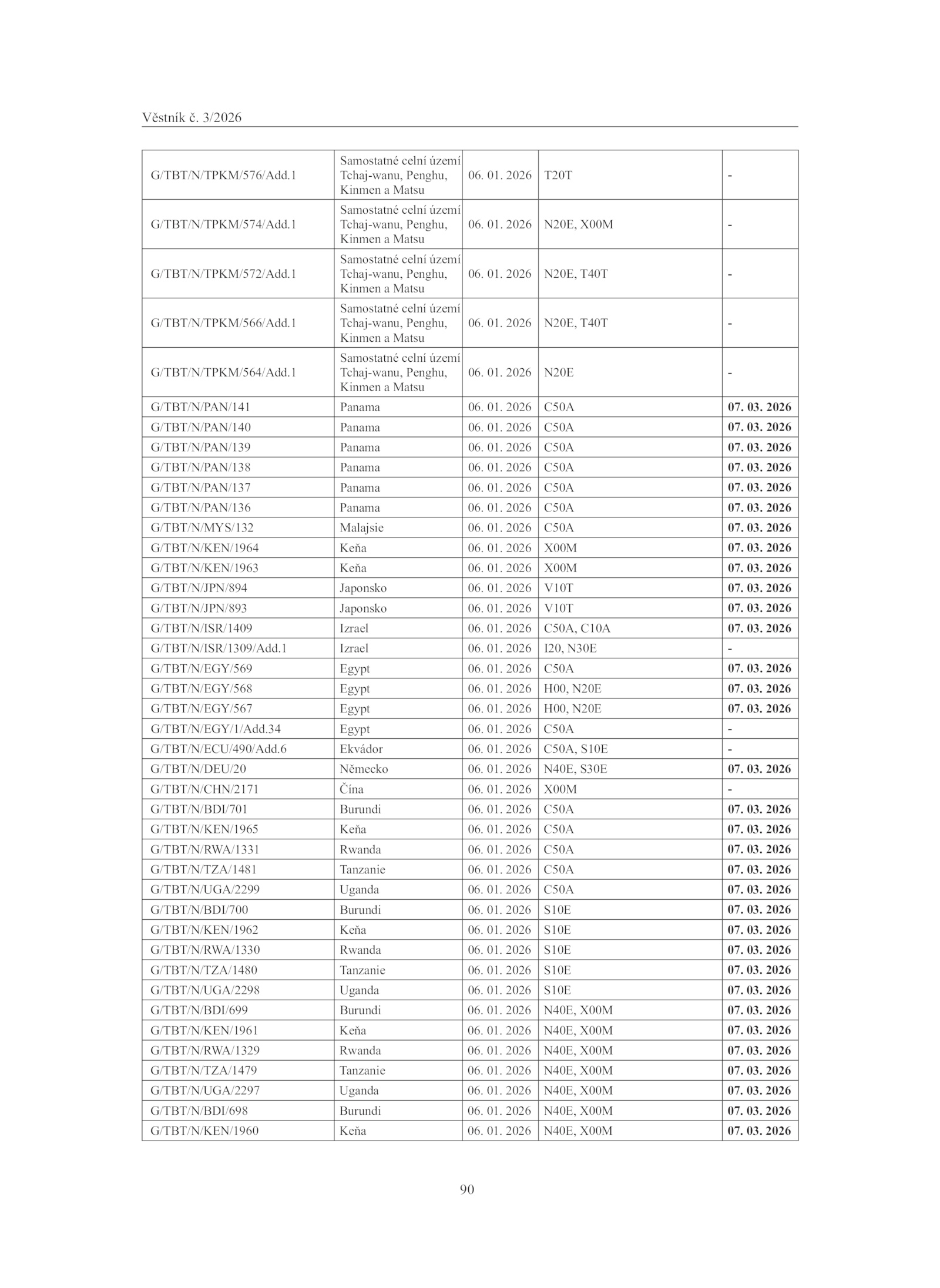 G/TBT/N/JPN/893 Japonsko 06. 2026 N40E, X00M 07. 01. 2026 C50A 07. 2026