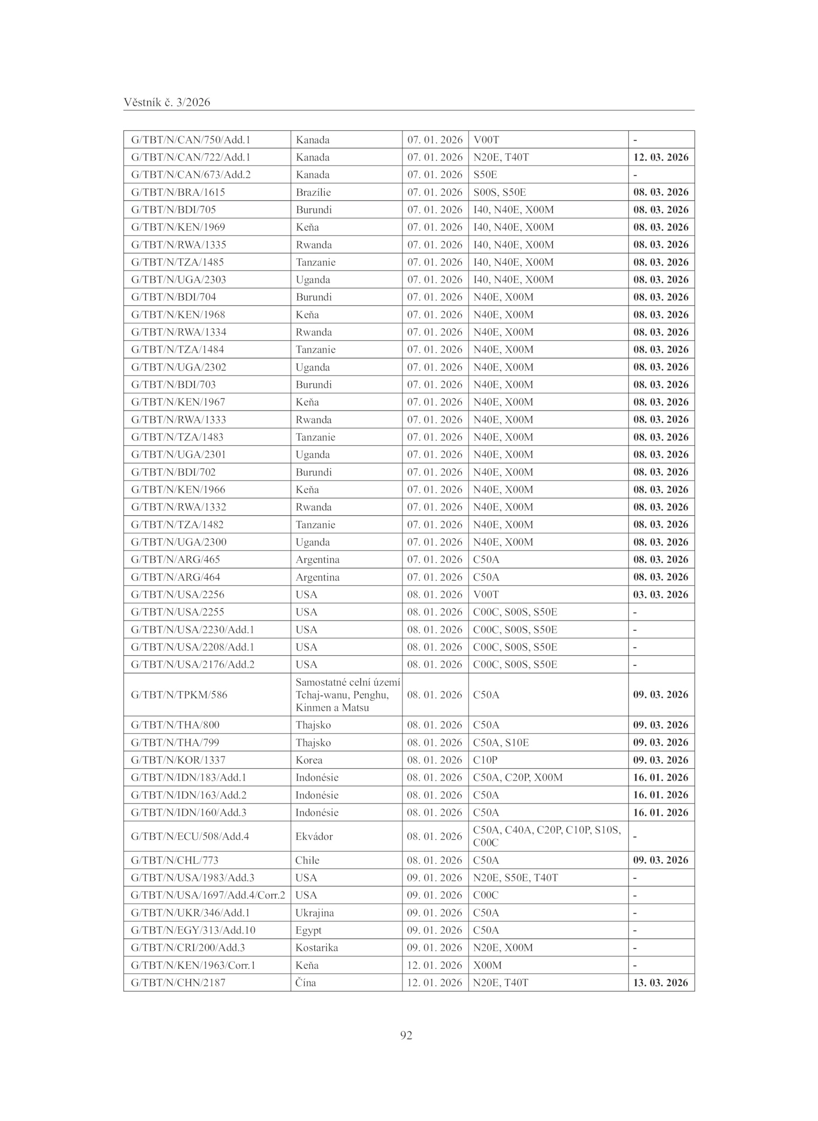 G/TBT/N/UGA/2302 Uganda 07. 01. 01. 2026 C10P 09. 03.1 Kanada 07. 2026 C50A 08. 2026