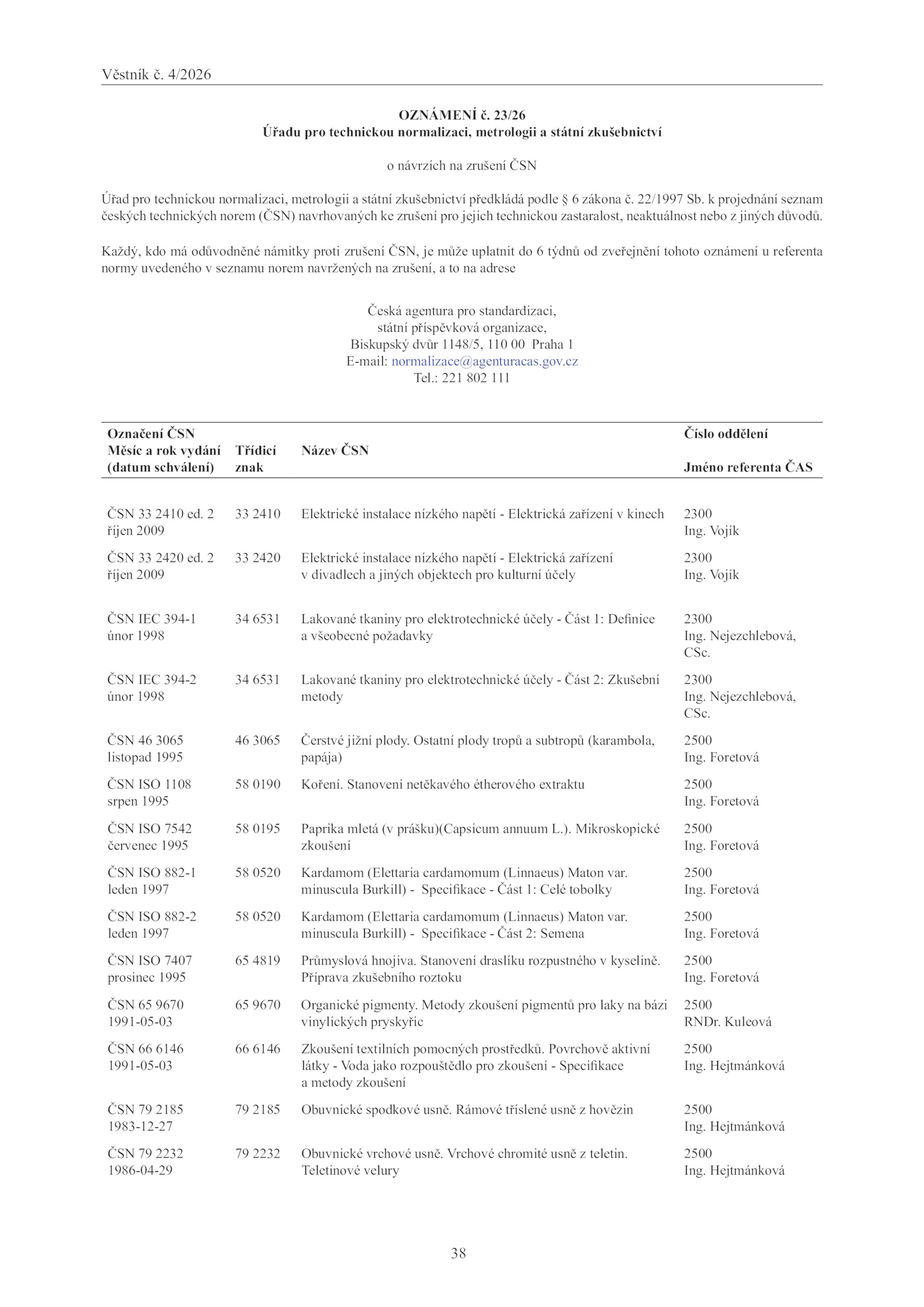 Každý, kdo odůvodněné námitky proti zrušení ČSN, může uplatnit týdnů zveřejnění tohoto oznámení referenta