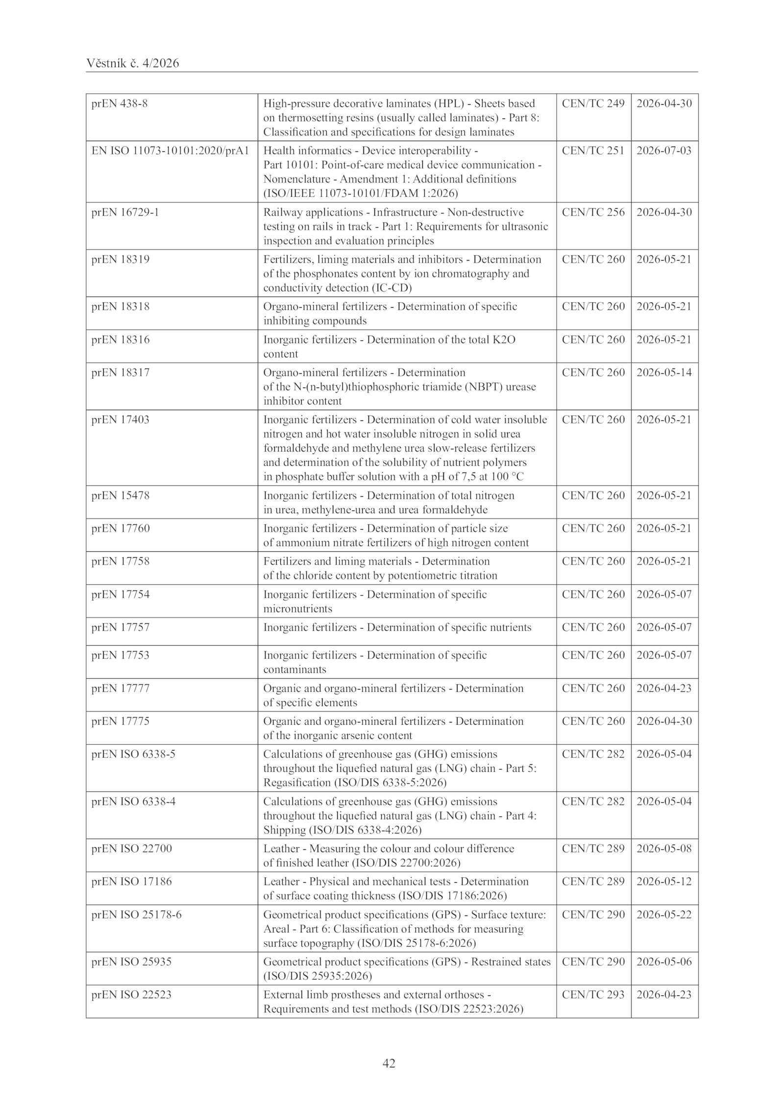 Věstník 4/2026 42 prEN 438-8 High-pressure decorative laminates (HPL) Sheets based on thermosetting resins (usually called laminates) Part 8: Classification and specifications for design laminates CEN/TC 249 2026-04-30 EN ISO 11073-10101:2020/prA1 Health informatics Device interoperability - Part 10101: Point-of-care medical device communication - Nomenclature Amendment Additional definitions (ISO/IEEE 11073-10101/FDAM 1:2026) CEN/TC 251 2026-07-03 prEN 16729-1 Railway applications Infrastructure Non-destructive testing rails track Part Requirements for ultrasonic inspection and evaluation principles CEN/TC 256 2026-04-30 prEN 18319 Fertilizers, liming materials and inhibitors Determination of the phosphonates content ion chromatography and conductivity detection (IC-CD) CEN/TC 260 2026-05-21 prEN 18318 Organo-mineral fertilizers Determination specific inhibiting compounds CEN/TC 260 2026-05-21 prEN 18316 Inorganic fertilizers Determination the total K2O content CEN/TC 260 2026-05-21 prEN 18317 Organo-mineral fertilizers Determination of the N-(n-butyl)thiophosphoric triamide (NBPT) urease inhibitor content CEN/TC 260 2026-05-14 prEN 17403 Inorganic fertilizers Determination cold water insoluble nitrogen and hot water insoluble nitrogen solid urea formaldehyde and methylene urea slow-release fertilizers and determination the solubility nutrient polymers in phosphate buffer solution with 7,5 100 °C CEN/TC 260 2026-05-21 prEN 15478 Inorganic fertilizers Determination total nitrogen in urea, methylene-urea and urea formaldehyde CEN/TC 260 2026-05-21 prEN 17760 Inorganic fertilizers Determination particle size of ammonium nitrate fertilizers high nitrogen content CEN/TC 260 2026-05-21 prEN 17758 Fertilizers and liming materials Determination of the chloride content potentiometric titration CEN/TC 260 2026-05-21 prEN 17754 Inorganic fertilizers Determination specific micronutrients CEN/TC 260 2026-05-07 prEN 17757 Inorganic fertilizers Determination specific nutrients CEN/TC 260 2026-05-07 prEN 17753 Inorganic fertilizers Determination specific contaminants CEN/TC 260 2026-05-07 prEN 17777 Organic and organo-mineral fertilizers Determination of specific elements CEN/TC 260 2026-04-23 prEN 17775 Organic and organo-mineral fertilizers Determination of the inorganic arsenic content CEN/TC 260 2026-04-30 prEN ISO 6338-5 Calculations greenhouse gas (GHG) emissions throughout the liquefied natural gas (LNG) chain Part 5: Regasification (ISO/DIS 6338-5:2026) CEN/TC 282 2026-05-04 prEN ISO 6338-4 Calculations greenhouse gas (GHG) emissions throughout the liquefied natural gas (LNG) chain Part 4: Shipping (ISO/DIS 6338-4:2026) CEN/TC 282 2026-05-04 prEN ISO 22700 Leather Measuring the colour and colour difference of finished leather (ISO/DIS 22700:2026) CEN/TC 289 2026-05-08 prEN ISO 17186 Leather Physical and mechanical tests Determination of surface coating thickness (ISO/DIS 17186:2026) CEN/TC 289 2026-05-12 prEN ISO 25178-6 Geometrical product specifications (GPS) Surface texture: Areal Part Classification methods for measuring surface topography (ISO/DIS 25178-6:2026) CEN/TC 290 2026-05-22 prEN ISO 25935 Geometrical product specifications (GPS) Restrained states (ISO/DIS 25935:2026) CEN/TC 290 2026-05-06 prEN ISO 22523 External limb prostheses and external orthoses - Requirements and test methods (ISO/DIS 22523:2026) CEN/TC 293 2026-04-23