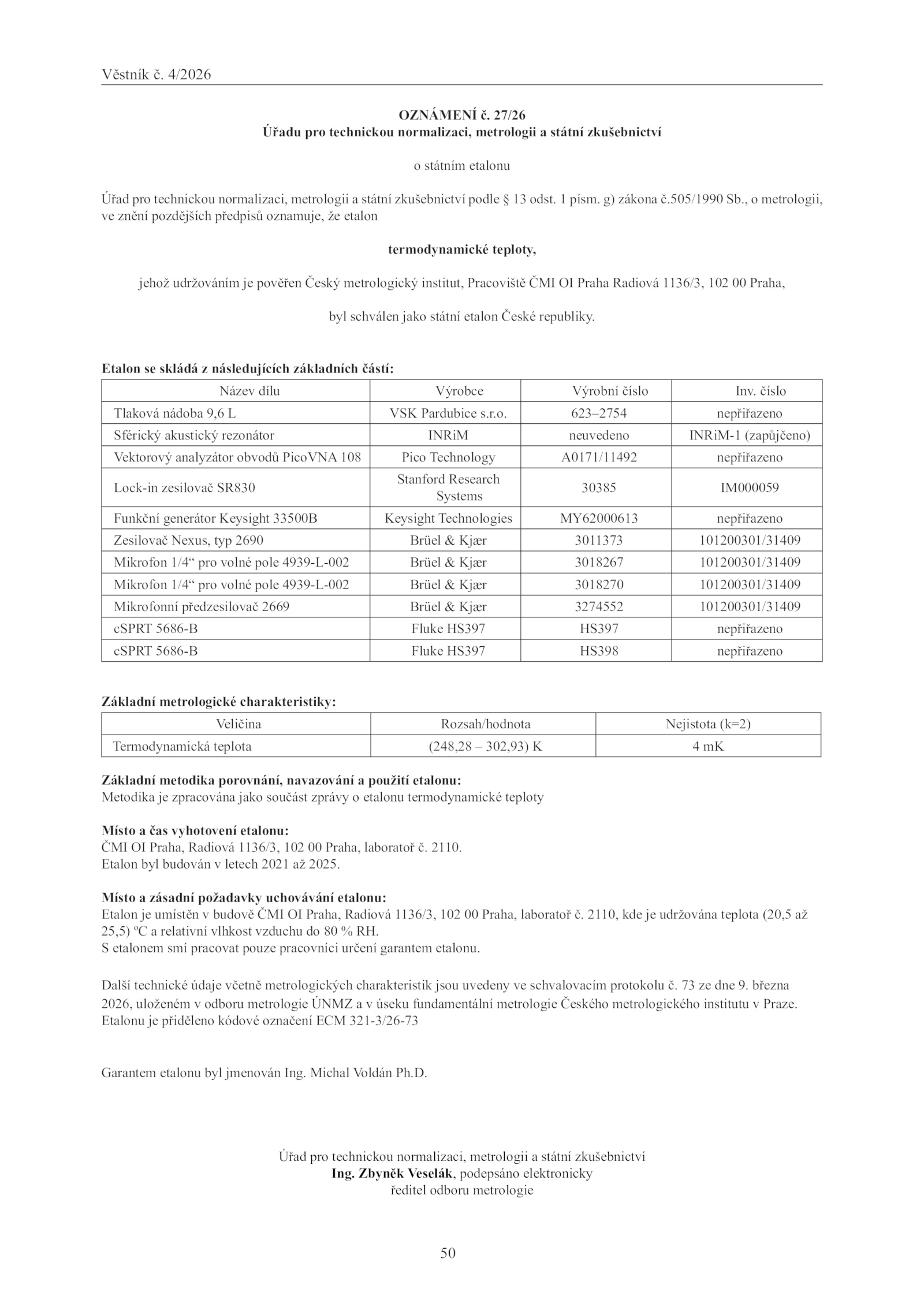 2026, uloženém odboru metrologie ÚNMZ úseku fundamentální metrologie Českého metrologického institutu Praze.