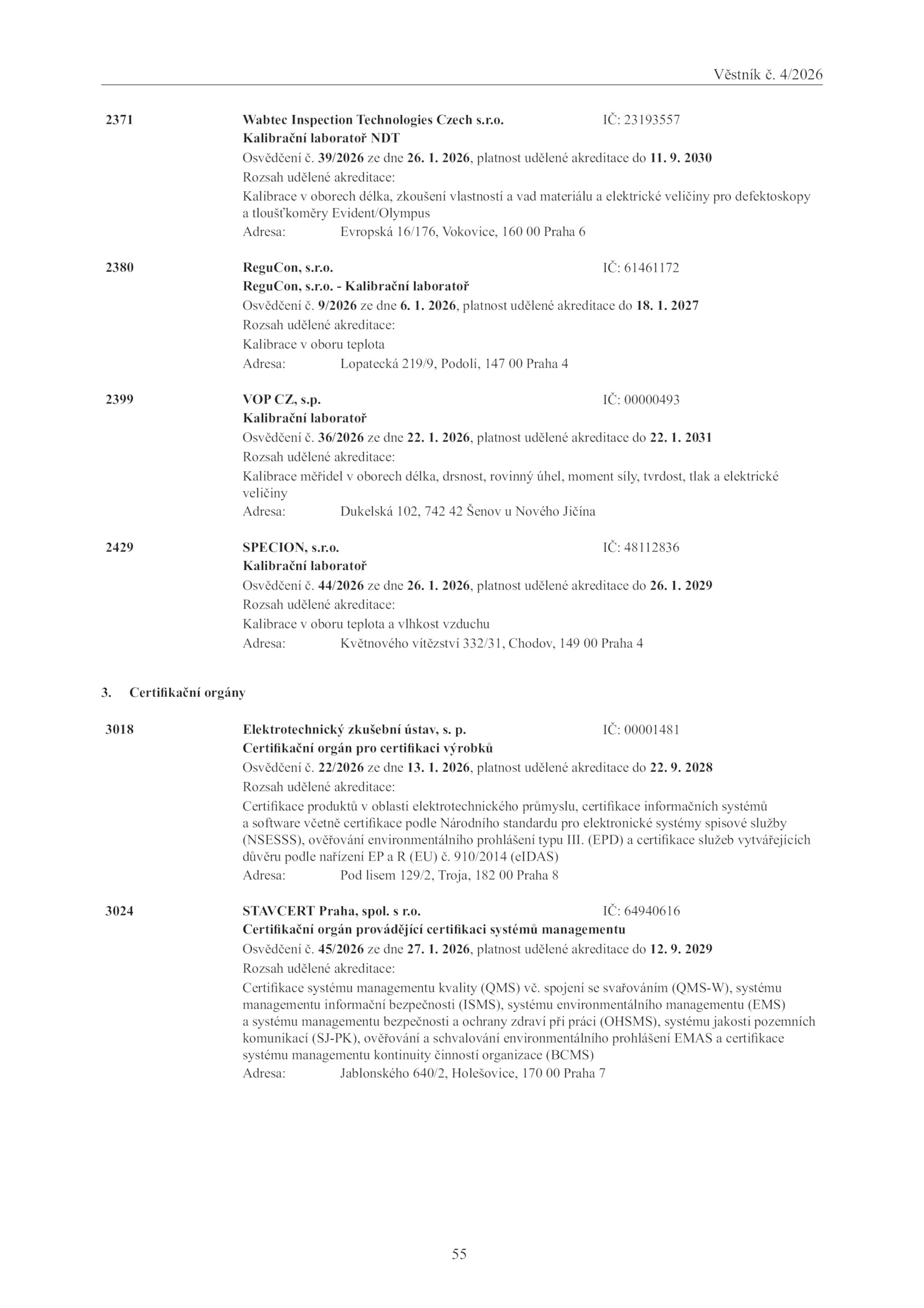 Osvědčení 39/2026 dne 26. 2026, platnost udělené akreditace 12. Certifikační orgány