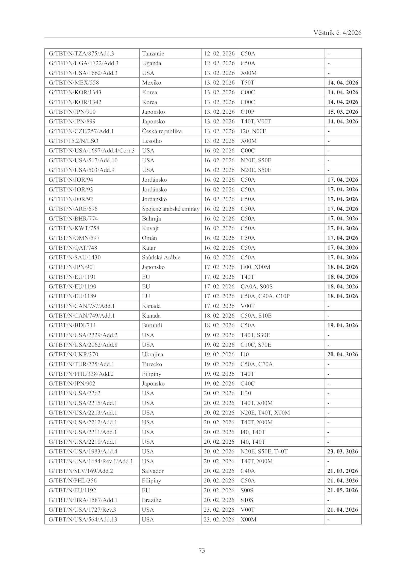 G/TBT/N/BHR/774 Bahrajn 16.1 USA 20.1 Brazílie 20.3 Tanzanie 12. 02.3 USA 23. 02. 02. 2026 C50A 17. 02. 02. 2026 T40T 18. 2026 X00M -