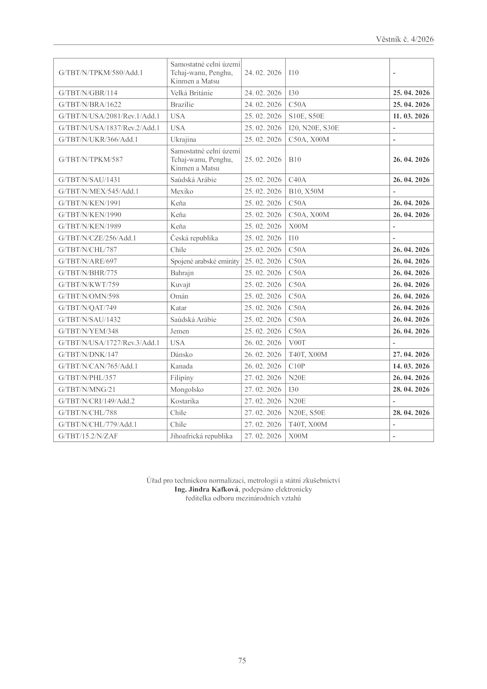 G/TBT/N/CZE/256/Add. 04.1/Add. 2026 C50A 26. 02.2/N/ZAF Jihoafrická republika 27. 02.1 Mexiko 25. 2026 C50A, X00M -