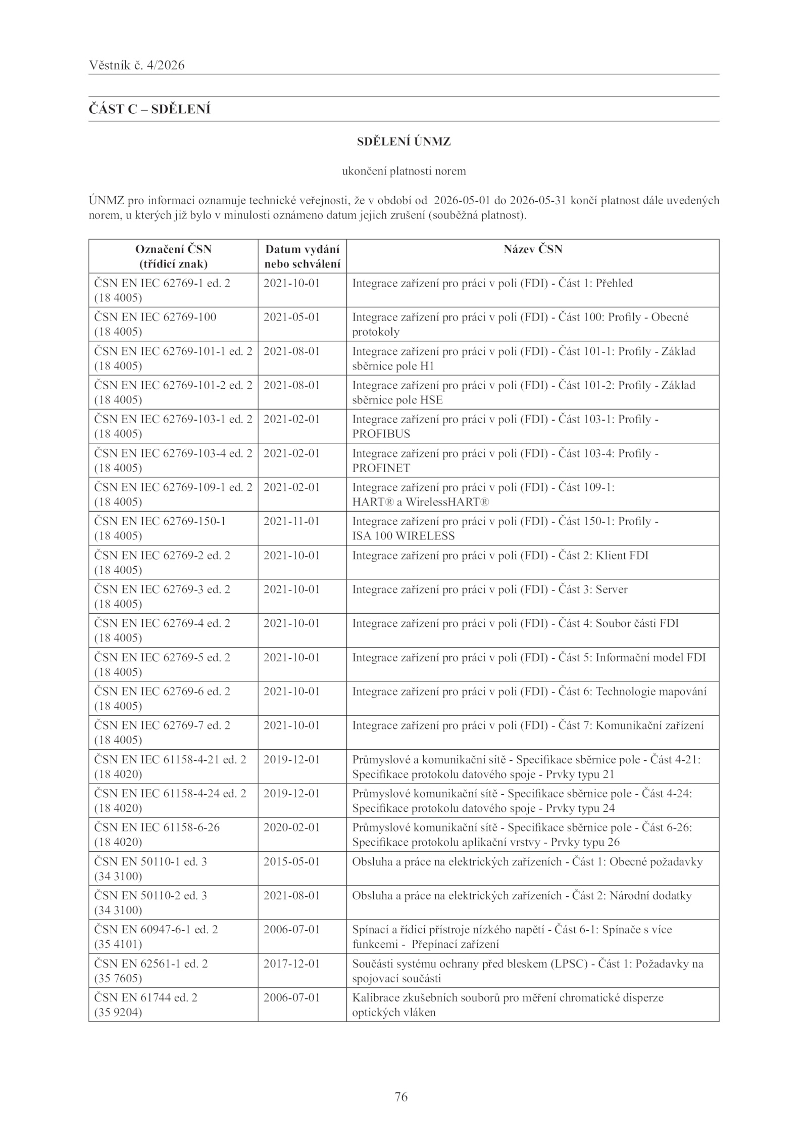 ÚNMZ pro informaci oznamuje technické veřejnosti, období 2026-05-01 2026-05-31 končí platnost dále uvedených