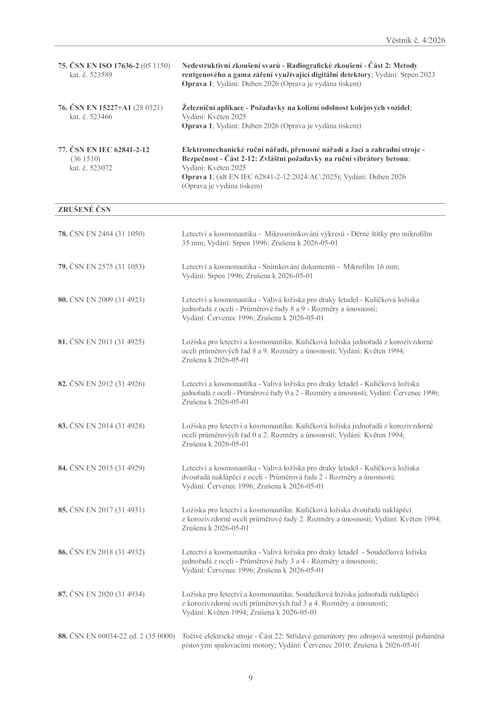 ČSN 2484 (31 1050) Letectví kosmonautika Mikrosnímkování výkresů Děrné štítky pro mikrofilm 35 mm; Vydání: Srpen 1996; Zrušena 2026-05-01 79. Kuličková ložiska jednořadá korozivzdorné oceli průměrových řad Rozměry únosnosti; Vydání: Květen 1994; Zrušena 2026-05-01 82. ČSN 2009 (31 4923) Letectví kosmonautika Valivá ložiska pro draky letadel Kuličková ložiska jednořadá oceli Průměrové řady Rozměry únosnosti; Vydání: Červenec 1996; Zrušena 2026-05-01 81. ČSN IEC 62841-2-12 (36 1510) kat. Kuličková ložiska dvouřadá naklápěcí z korozivzdorné oceli průměrové řady Rozměry únosnosti; Vydání: Květen 1994; Zrušena 2026-05-01 86. ČSN 2018 (31 4932) Letectví kosmonautika Valivá ložiska pro draky letadel Soudečková ložiska jednořadá oceli Průměrové řady Rozměry únosnosti; Vydání: Červenec 1996; Zrušena 2026-05-01 87.9 Věstník 4/2026 75. ČSN 60034-22 ed. ČSN 2575 (31 1053) Letectví kosmonautika Snímkování dokumentů Mikrofilm mm; Vydání: Srpen 1996; Zrušena 2026-05-01 80. 523589 Nedestruktivní zkoušení svarů Radiografické zkoušení Část Metody rentgenového gama záření využívající digitální detektory; Vydání: Srpen 2023 Oprava Vydání: Duben 2026 (Oprava vydána tiskem) 76. ČSN ISO 17636-2 (05 1150) kat. ČSN 2011 (31 4925) Ložiska pro letectví kosmonautiku. Soudečková ložiska jednořadá naklápěcí z korozivzdorné oceli průměrových řad Rozměry únosnosti; Vydání: Květen 1994; Zrušena 2026-05-01 88. (35 0000) Točivé elektrické stroje Část 22: Střídavé generátory pro zdrojová soustrojí poháněná pístovými spalovacími motory; Vydání: Červenec 2010; Zrušena 2026-05-01 . ČSN 2017 (31 4931) Ložiska pro letectví kosmonautiku. ČSN 2014 (31 4928) Ložiska pro letectví kosmonautiku. 523466 Železniční aplikace Požadavky kolizní odolnost kolejových vozidel; Vydání: Květen 2025 Oprava Vydání: Duben 2026 (Oprava vydána tiskem) 77. ČSN 2015 (31 4929) Letectví kosmonautika Valivá ložiska pro draky letadel Kuličková ložiska dvouřadá naklápěcí oceli Průměrová řada Rozměry únosnosti; Vydání: Červenec 1996; Zrušena 2026-05-01 85. ČSN 2020 (31 4934) Ložiska pro letectví kosmonautiku. ČSN 15227+A1 (28 0321) kat. 523072 Elektromechanické ruční nářadí, přenosné nářadí žací zahradní stroje - Bezpečnost Část 2-12: Zvláštní požadavky ruční vibrátory betonu; Vydání: Květen 2025 Oprava (idt IEC 62841-2-12:2024/AC:2025); Vydání: Duben 2026 (Oprava vydána tiskem) ZRUŠENÉ ČSN 78. ČSN 2012 (31 4926) Letectví kosmonautika Valivá ložiska pro draky letadel Kuličková ložiska jednořadá oceli Průměrové řady Rozměry únosnosti; Vydání: Červenec 1996; Zrušena 2026-05-01 83. Kuličková ložiska jednořadá korozivzdorné oceli průměrových řad Rozměry únosnosti; Vydání: Květen 1994; Zrušena 2026-05-01 84