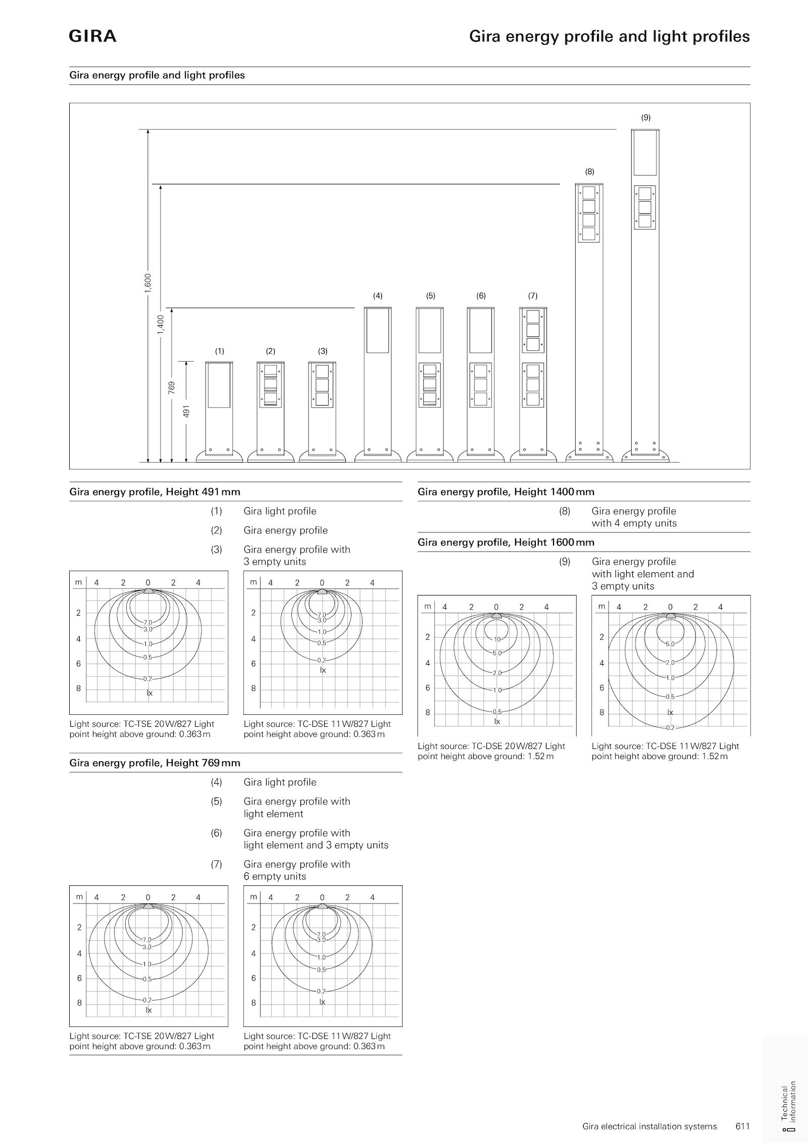 0 1.0 2.5 0.0 1.0 3.5 0.0 1.363m Gira energy profile, Height 769mm (4) Gira light profile (5) Gira energy profile with light element (6) Gira energy profile with light element and empty units (7) Gira energy profile with 6 empty units 7.0 3.52m Light source: TC-DSE 11W/827 Light point height above ground: 1.611 Gira electrical installation systems Gira energy profile and light profiles I Technical information Gira energy profile and light profiles (1) (2) (3) (4) (5) (6) (9) (8) (7) 491 769 1,400 1,600 Gira energy profile, Height 491mm (1) Gira light profile (2) Gira energy profile (3) Gira energy profile with 3 empty units 7.5 0.0 0.2 7.52m .2 Light source: TC-TSE 20W/827 Light point height above ground: 0.0 3.5 0.363m Light source: TC-DSE 11W/827 Light point height above ground: 0.0 1.0 1.0 3.0 0.363m Light source: TC-DSE 11W/827 Light point height above ground: 0.5 5.0 2.0 0.2 Light source: TC-DSE 20W/827 Light point height above ground: 1.363m Gira energy profile, Height 1400mm (8) Gira energy profile with empty units Gira energy profile, Height 1600mm (9) Gira energy profile with light element and 3 empty units 10 5.0 0.2 Light source: TC-TSE 20W/827 Light point height above ground: 0.0 0.5 0.2 7.0 1.0 0