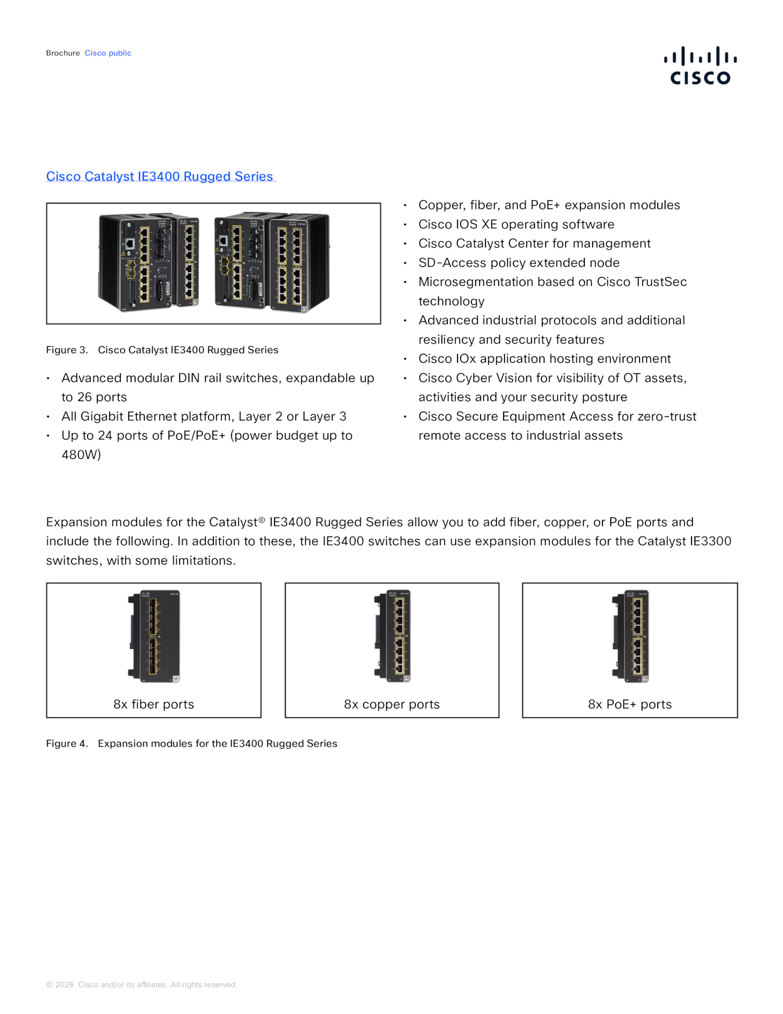 Expansion modules for the Catalyst® IE3400 Rugged Series allow you add fiber, copper, PoE ports and
