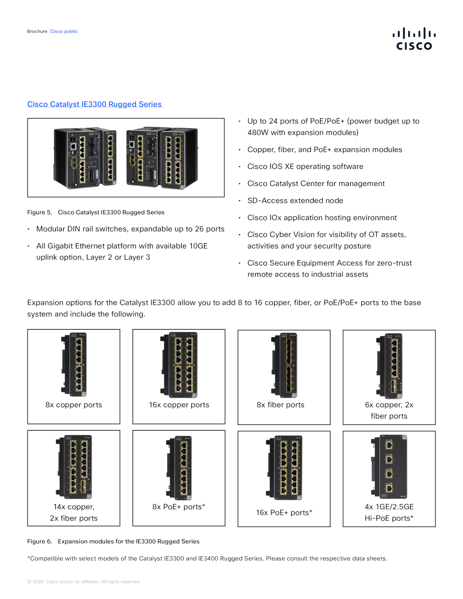 Expansion options for the Catalyst IE3300 allow you add copper, fiber, PoE/PoE+ ports the base