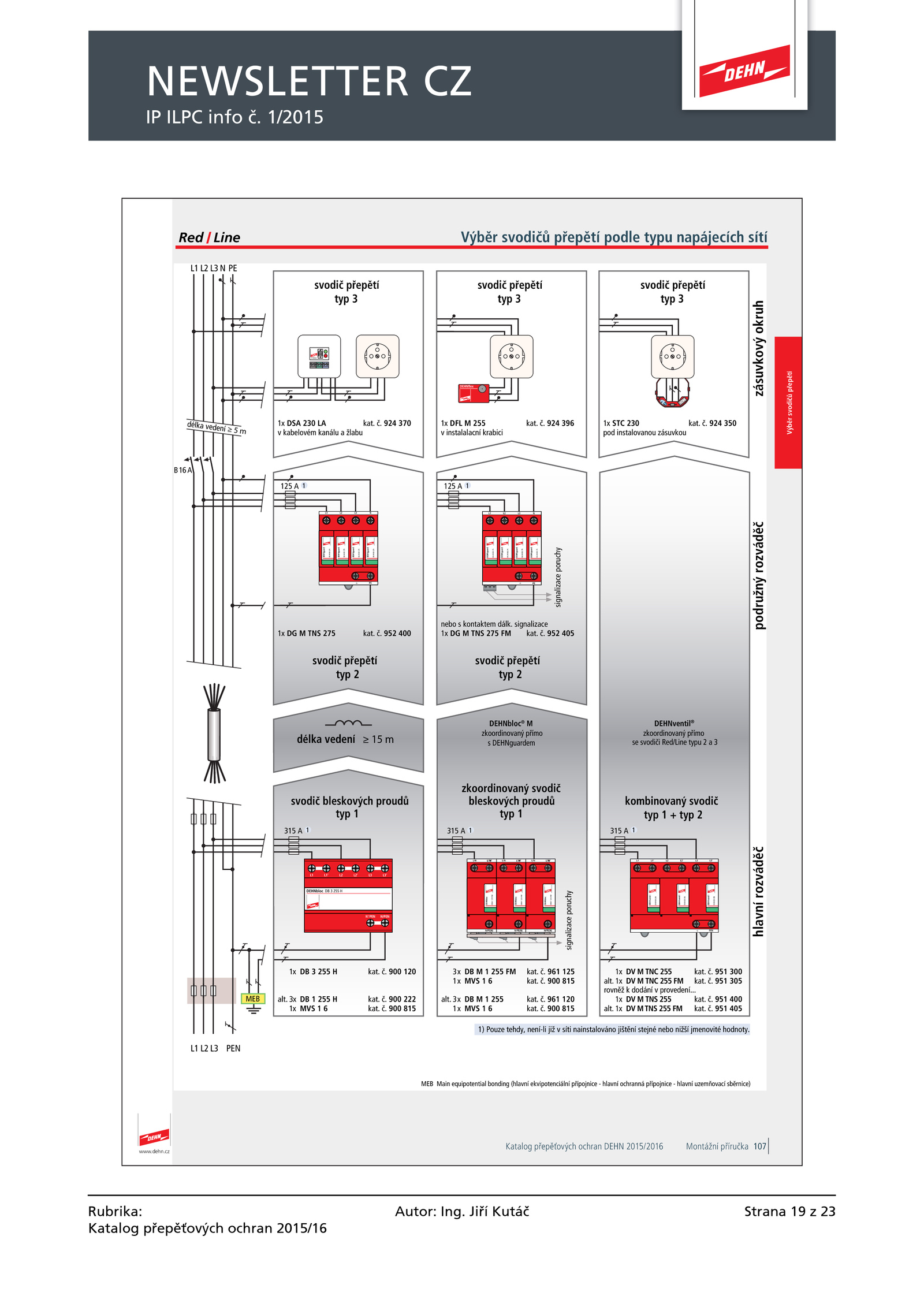 TNC 255 951 305 1x TNS 255 951 400 alt.dehn.cz Výb svodi podle typu napájecích sítíRed Line Výbrsvodipeptí 107Katalog ových ochran DEHN 2015/2016 Montážní íru ka L1 PE DEHNguard DGMOD275 DEHNguard DGMOD275 L1 L2 PE DEHNguard DGMOD275 L3 DEHNguard DGMOD275 N 9 DEHNguard DGMOD275 DEHNguard DGMOD275 L1 L2 PE DEHNguard DGMOD275 L3 DEHNguard DGMOD275 N 9 L1 PEN L1 L1’ L2’ L3’ N‘/PEN N/PEN DEHNbloc 255 H L1 L1‘ L2‘ PEN L3 L3‘ DEHNventil DVMOD255 DEHNventil DVMOD255 DEHNventil DVMOD255 9 DEHNbloc DBM1255FM N/PE(N) L/N DEHNbloc DBM1255FM N/PE(N) L/N DEHNbloc DBM1255FM N/PE(N) L/N S-Schutz 1 A zásuvkovýokruh 1x DSA 230 924 370 STC 230 924 350 pod instalovanou zásuvkou nebo kontaktem dálk. MTNS 255 951 405 1125 1125 A 1x TNS 275 952 400 délka vedení m 1x 255 900 120 alt. 255 900 222 1x MVS 900 815 1315 A 3x 255 961 125 1x MVS 900 815 alt. 255 961 120 1x MVS 900 815 1315 A 1x DFL 255 924 396 1315 A ≥ m typ typ typ 3 typ typ 2 signalizaceporuchy signalizaceporuchy MEB typ typ 2 DEHNventil® typ 1 DEHNbloc® M s DEHNguardem typ 1 6B MEB Main equipotential bonding (hlavní ekvipotenciální ípojnice hlavní ochranná ípojnice hlavní uzem ovací rnice) Výb svodi podle typu napájecích sítí .NEWSLETTER CZ IP ILPC info 1/2015 Strana 23Rubrika: Katalog přepěťových ochran 2015/16 Autor: Ing. Jiří Kutáč www. signalizace 1x TNS 275 952 405 1x TNC 255 951 300 alt