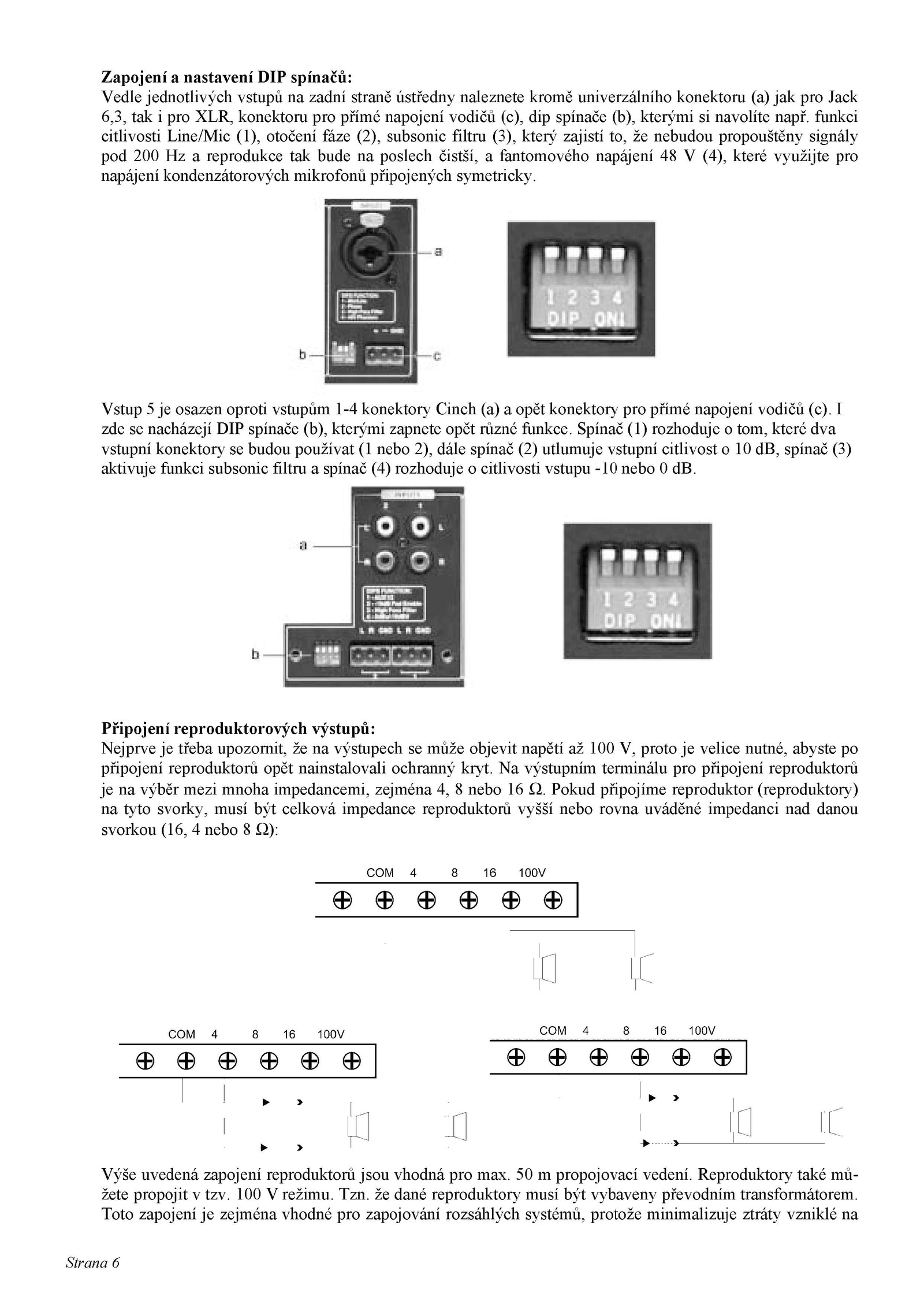 zde nacházejí DIP spínače (b), kterými zapnete opět různé funkce. propojovací vedení. dané reproduktory musí být vybaveny převodním transformátorem. Reproduktory také mů