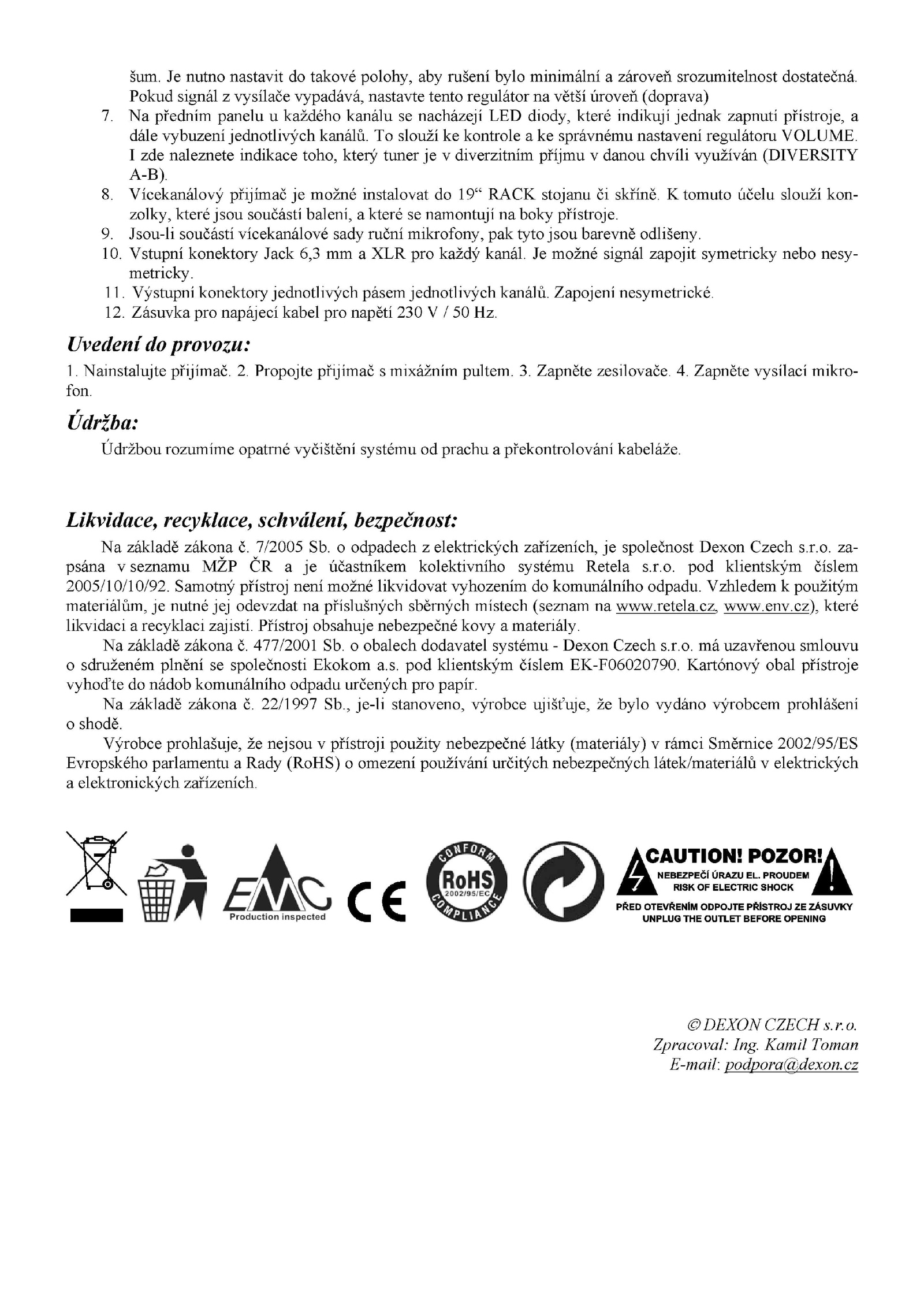 © DEXON CZECH s. Výstupní konektory jednotlivých pásem jednotlivých kanálů. Vstupní konektory Jack 6,3 XLR pro každý kanál. odpadech elektrických zařízeních, společnost Dexon Czech s. pod klientským číslem