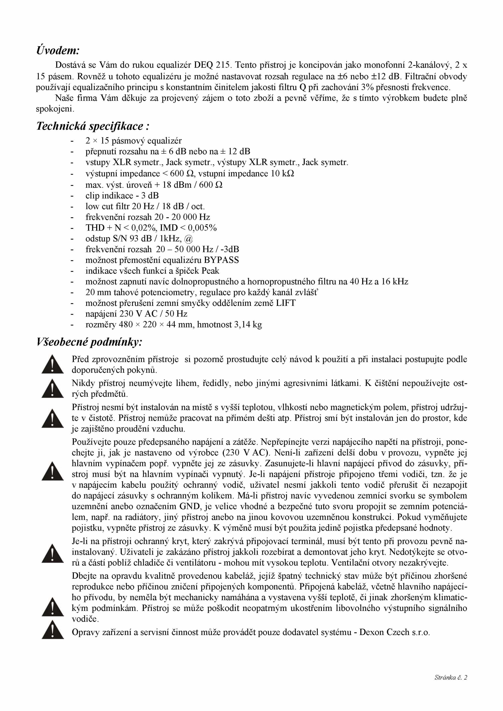rú částí poblíž chladiče ventilátoru mohou mít vysokou teplotu. Rovněž tohoto equalizéru možné nastavovat rozsah regulace nebo ±12 dB., Jack symetr.Dostává Vám rukou equalizér DEQ 215. je