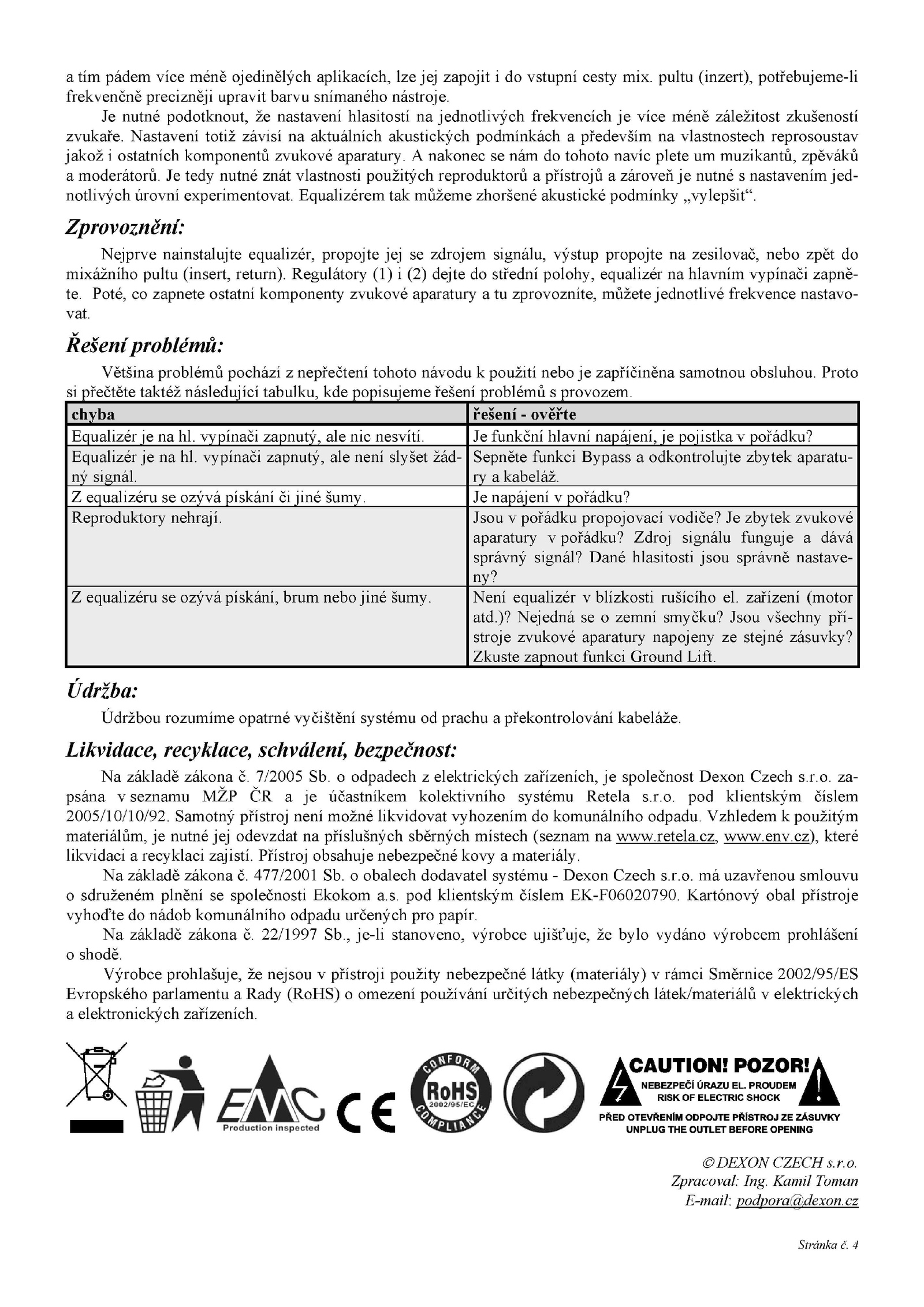 Z equalizéru ozývá pískání, brum nebo jiné šumy. odpadech elektrických zařízeních, společnost Dexon Czech s. pultu (inzert), potřebujeme-li