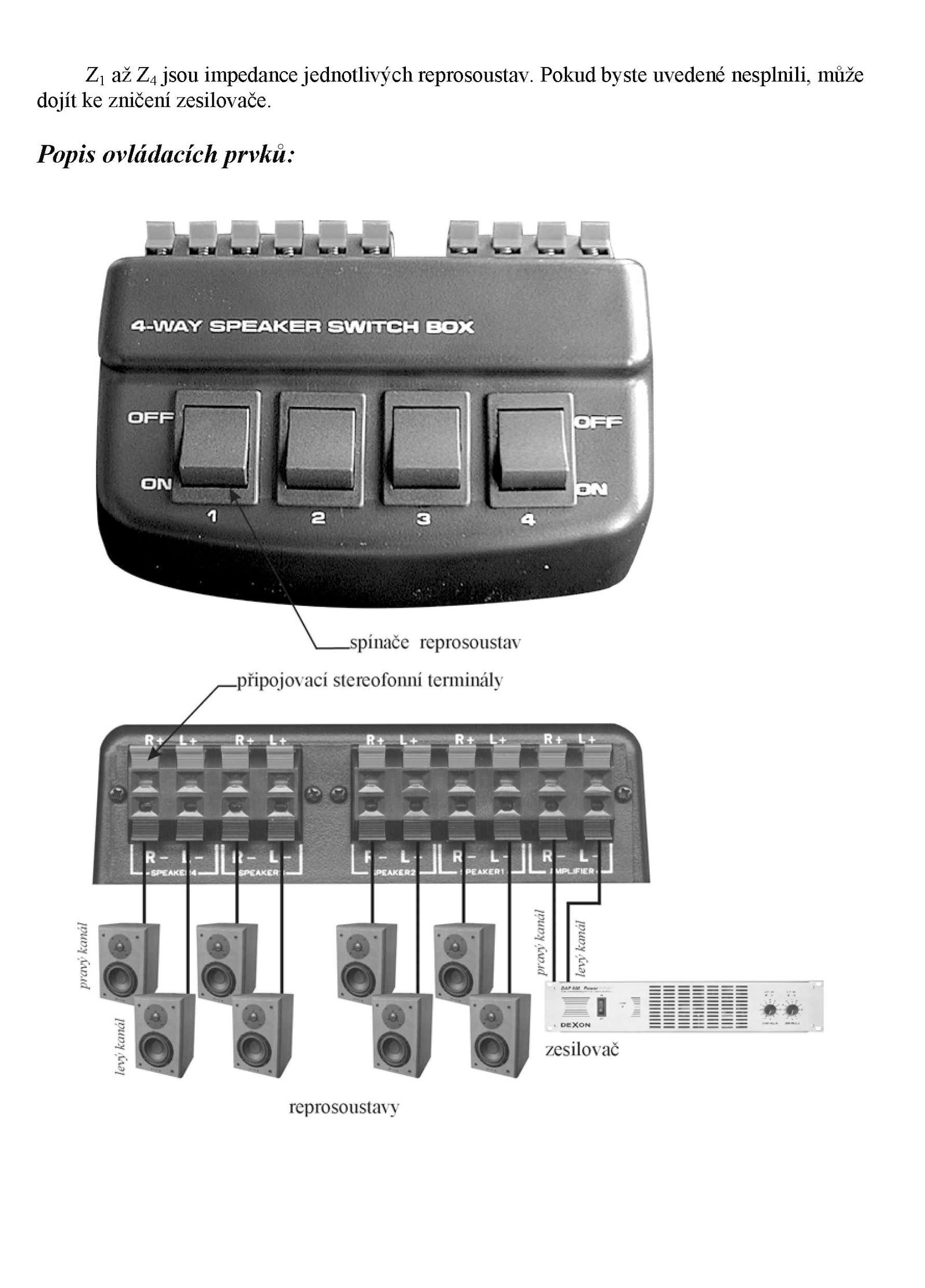Pokud byste uvedené nesplnili, může dojít zničení zesilovače.připojovací stereofonní terminály reprosoustavy .pravý'kanálZ, Z4jsou impedancejednotlivých reprosoustav. Popis ovládacích prvků: reprosoustav