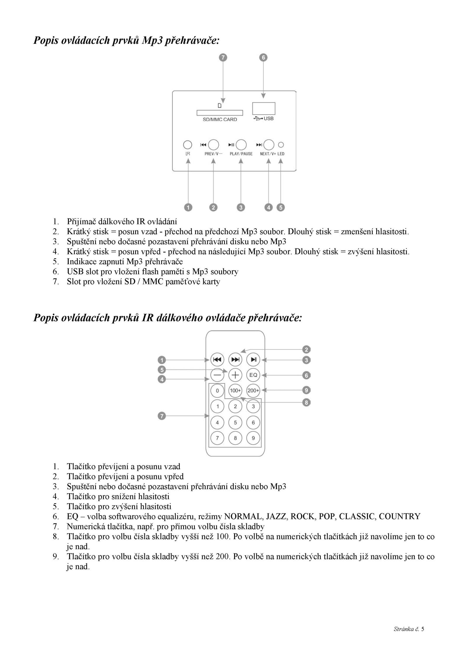 4.Popis ovládacích prvků Mp3 přehrávače: