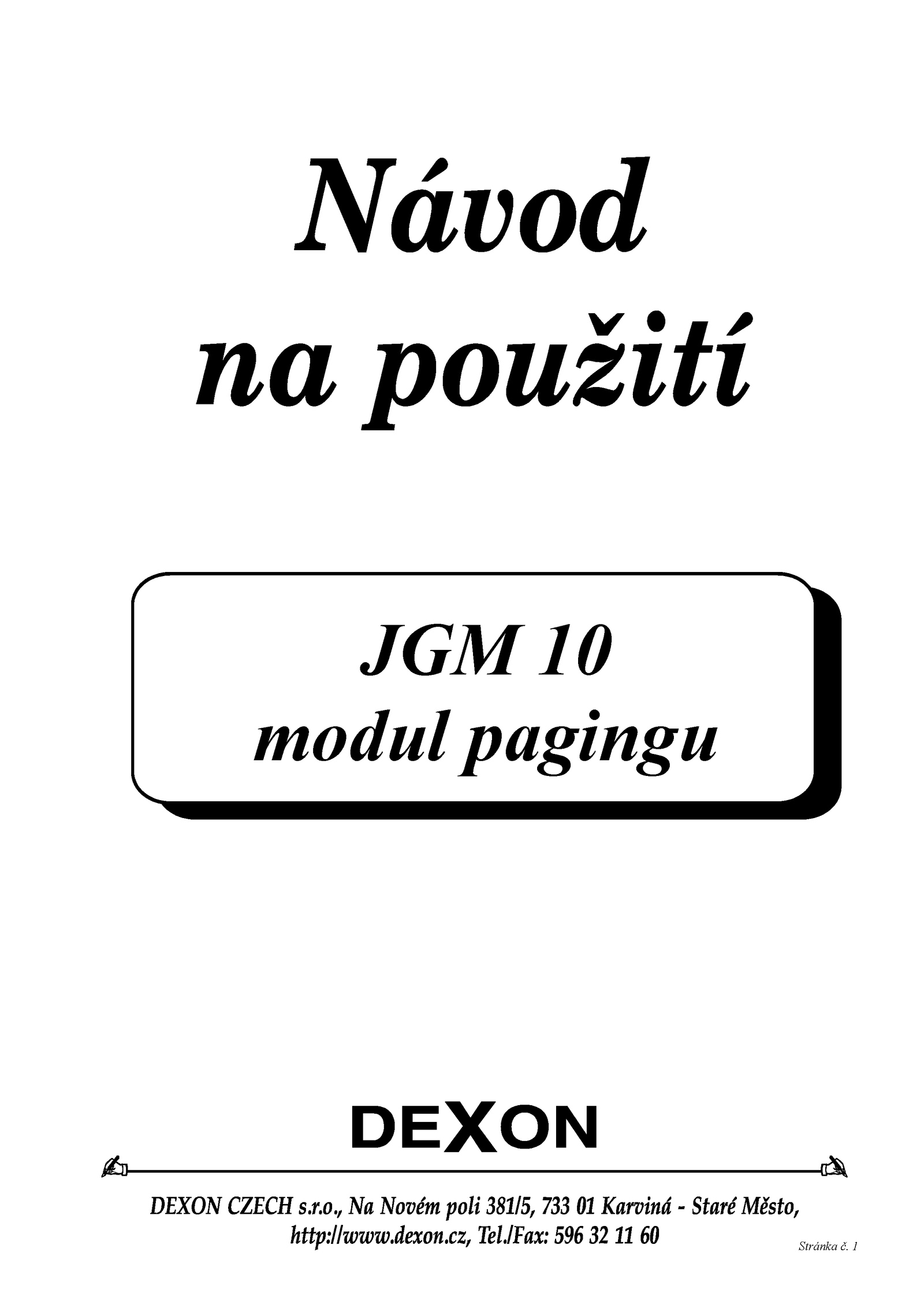 cz, TelJFax: 596 Stránka., Novém poli 38115, 733 Karviná Staré Mesto, http:llwww.r.Návod na použití JGM10 modulpagingu DEXON DEXON CZECH s.dexon.o