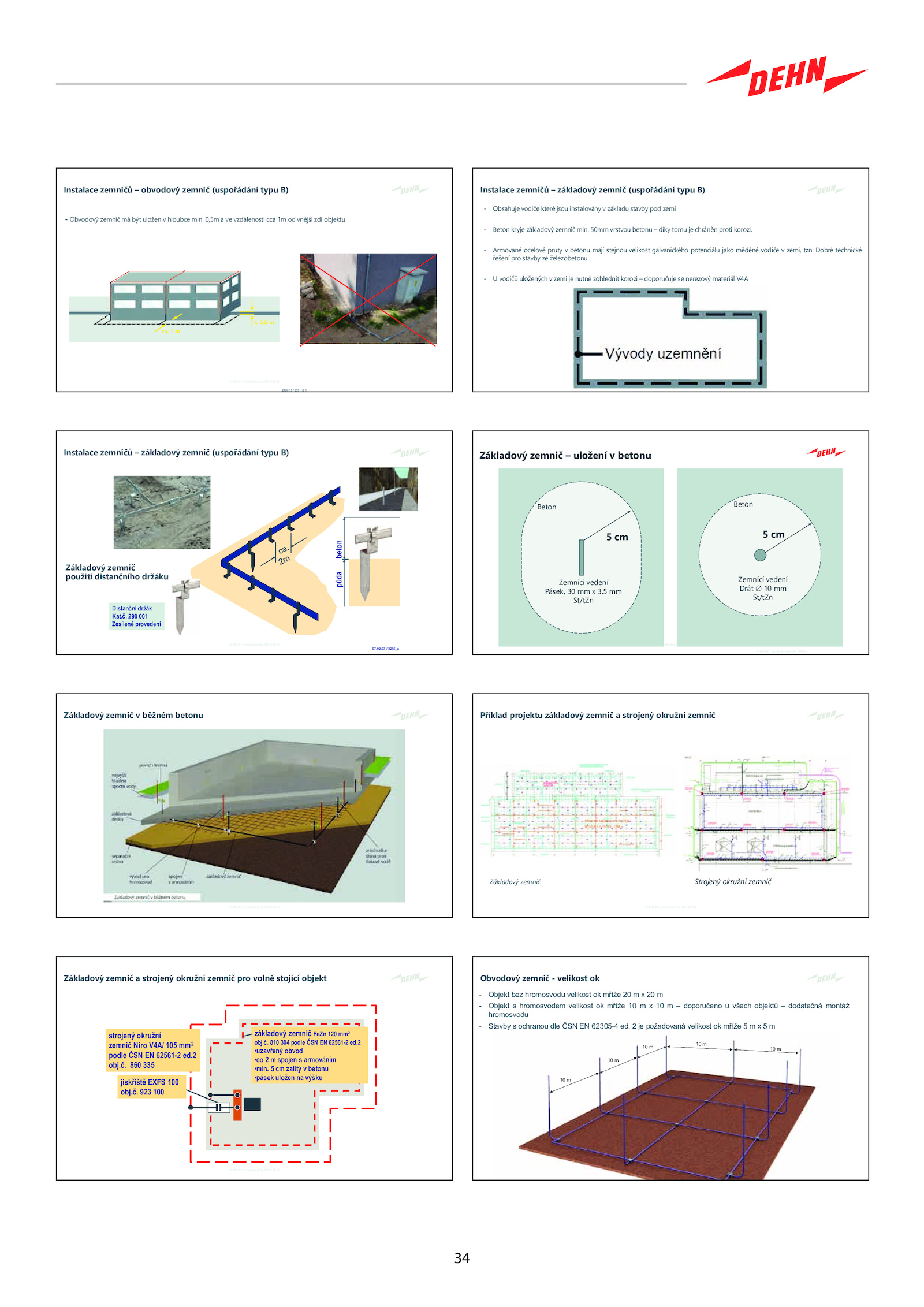 2 obj.02.13 6551 1 ≥ 0,5 m ca. 0,5m vzdálenosti cca vnější zdí objektu. 860 335 jiskřiště EXFS 100 obj. požadovaná velikost mříže.č.č. - vodičů uložených zemi nutné zohlednit korozi doporučuje nerezový materiál V4A © DEHN protected ISO 16016 © DEHN protected ISO 16016 Základový zemnič uložení betonu Beton Zemnící vedení Pásek, 3.34 © DEHN protected ISO 16016 Instalace zemničů obvodový zemnič (uspořádání typu B) - Obvodový zemnič být uložen hloubce min. 290 001 Zesílené provedení půda beton Instalace zemničů základový zemnič (uspořádání typu B) © DEHN protected ISO 16016 Základový zemnič běžném betonu © DEHN protected ISO 16016 základový zemnič FeZn 120 mm2 obj. 923 100 Základový zemnič strojený okružní zemnič pro volně stojící objekt © DEHN protected ISO 16016 Instalace zemničů základový zemnič (uspořádání typu B) - Obsahuje vodiče které jsou instalovány základu stavby pod zemí - Beton kryje základový zemnič min.2 •uzavřený obvod •co spojen armováním •min.5 mm St/tZn 5 cm Zemnící vedení Drát mm St/tZn 5 cm Beton © DEHN protected ISO 16016 Základový zemnič Příklad projektu základový zemnič strojený okružní zemnič Strojený okružní zemnič © DEHN protected ISO 16016 Obvodový zemnič velikost ok 10 m 10 m 10 m 10 m 10 m - Objekt bez hromosvodu velikost mříže m - Objekt hromosvodem velikost mříže doporučeno všech objektů dodatečná montáž hromosvodu - Stavby ochranou dle ČSN 62305-4 ed. - Armované ocelové pruty betonu mají stejnou velikost galvanického potenciálu jako měděné vodiče zemi, tzn.03 2285_a Základový zemnič použití distančního držáku Distanční držák Kat. 24. Dobré technické řešení pro stavby železobetonu.č. 810 304 podle ČSN 62561-2 ed. 50mm vrstvou betonu díky tomu chráněn proti korozi.č. zalitý betonu •pásek uložen výšku EP strojený okružní zemnič Niro V4A/ 105 mm2 podle ČSN 62561-2 ed.06. m © DEHN protected ISO 16016 07