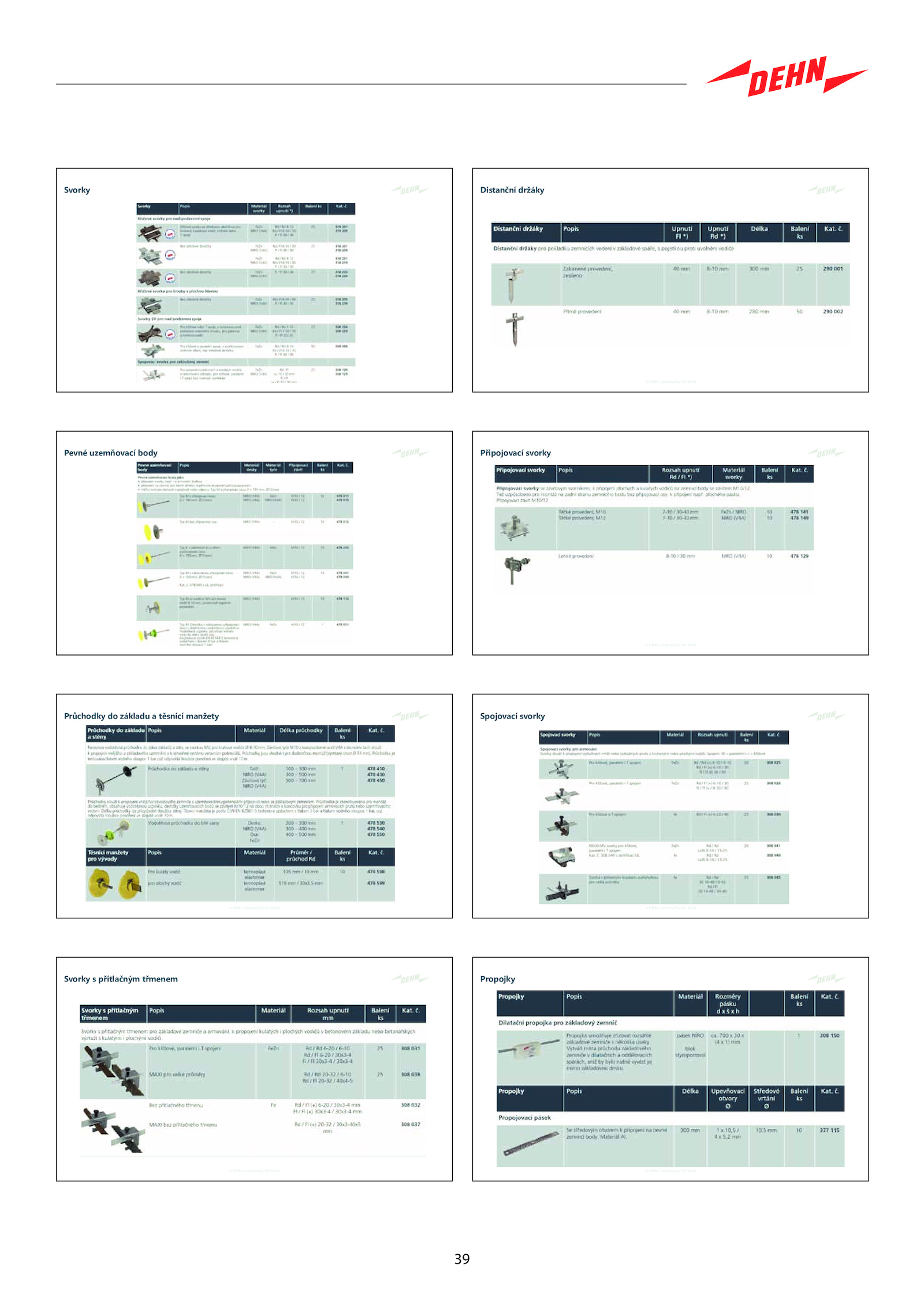 39 © DEHN protected ISO 16016 Svorky © DEHN protected ISO 16016 Pevné uzemňovací body © DEHN protected ISO 16016 Průchodky základu těsnící manžety © DEHN protected ISO 16016 Svorky přítlačným třmenem © DEHN protected ISO 16016 Distanční držáky © DEHN protected ISO 16016 Připojovací svorky © DEHN protected ISO 16016 Spojovací svorky © DEHN protected ISO 16016 Propojky