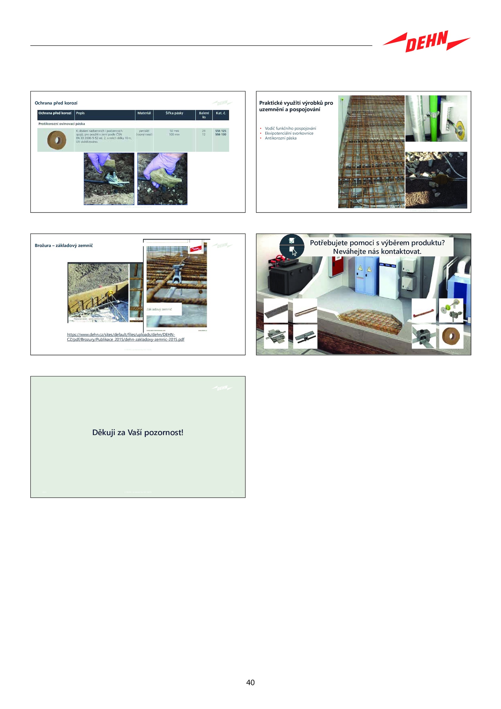 pdf Brožura základový zemnič © DEHN protected ISO 16016 © DEHN protected ISO 16016 Děkuji Vaší pozornost! 2023 76 © DEHN protected ISO 16016 © DEHN protected ISO 16016 Praktické využití výrobků pro uzemnění pospojování • Vodič funkčního pospojování • Ekvipotenciální svorkovnice • Antikorozní páska © DEHN protected ISO 16016 © DEHN protected ISO 16016 Potřebujete pomoci výběrem produktu? Neváhejte nás kontaktovat.cz/sites/default/files/uploads/dehn/DEHN- CZ/pdf/Brozury/Publikace_2015/dehn-zakladovy-zemnic-2015.40 © DEHN protected ISO 16016 Ochrana před korozí © DEHN protected ISO 16016 https://www. .dehn