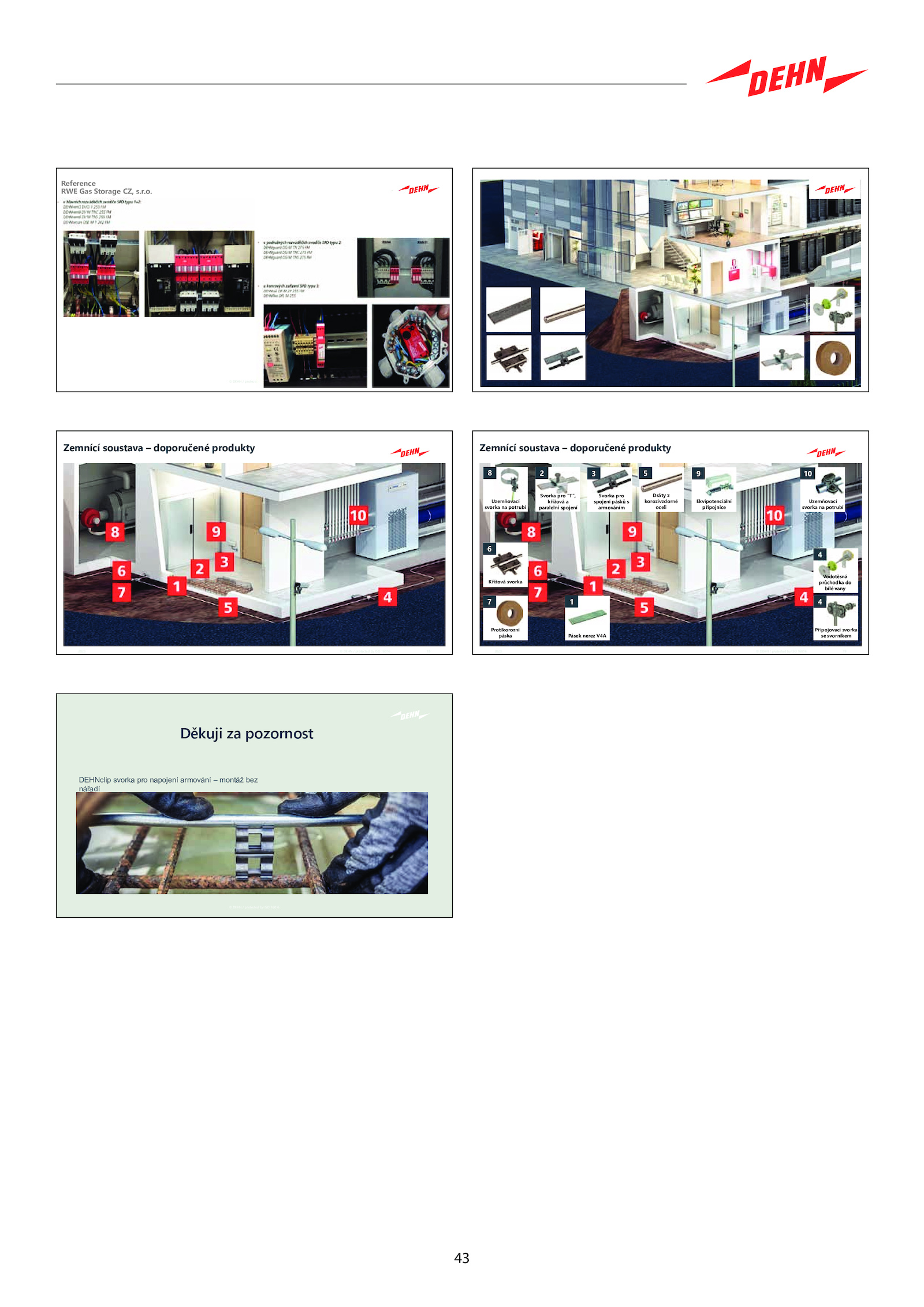 © DEHN protected ISO 16016 © DEHN protected ISO 16016 2023 18 Zemnící soustava doporučené produkty © DEHN protected ISO 16016 © DEHN protected ISO 16016 Děkuji pozornost DEHNclip svorka pro napojení armování montáž bez nářadí © DEHN protected ISO 16016 © DEHN protected ISO 16016 © DEHN protected ISO 16016 © DEHN protected ISO 16016 2023 19 Zemnící soustava doporučené produkty 10 9 7 4 4 1 2 5 6 8 Protikorozní páska Uzemňovací svorka potrubí Ekvipotenciální přípojnice Svorka pro "T", křížová a paralelní spojení Uzemňovací svorka potrubí Křížová svorka Vodotěsná průchodka do bílé vany Připojovací svorka se svorníkem Pásek nerez V4A Dráty z korozivzdorné oceli Svorka pro spojení pásků s armováním .43 © DEHN protected ISO 16016 Reference RWE Gas Storage CZ, s.r.o