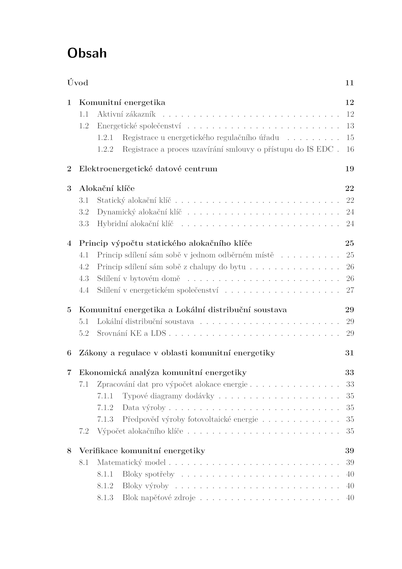 2.1.1 Aktivní zákazník 12 1.2 Dynamický alokační klíč 24 3.4 Sdílení energetickém společenství 27 5 Komunitní energetika Lokální distribuční soustava 29 5.Obsah Úvod 11 1 Komunitní energetika 12 1.2 Princip sdílení sám sobě chalupy bytu 26 4.2 Energetické společenství 13 1.1.3 Blok napěťové zdroje 40 .1.2 Výpočet alokačního klíče 35 8 Verifikace komunitní energetiky 39 8.1 Typové diagramy dodávky 35 7.2 Data výroby 35 7.2 Registrace proces uzavírání smlouvy přístupu EDC 16 2 Elektroenergetické datové centrum 19 3 Alokační klíče 22 3.1 Matematický model 39 8.3 Předpověď výroby fotovoltaické energie 35 7.1 Registrace energetického regulačního úřadu 15 1.2.3 Hybridní alokační klíč 24 4 Princip výpočtu statického alokačního klíče 25 4.1 Princip sdílení sám sobě jednom odběrném místě 25 4.1.1.3 Sdílení bytovém domě 26 4.2 Srovnání LDS 29 6 Zákony regulace oblasti komunitní energetiky 31 7 Ekonomická analýza komunitní energetiky 33 7.1.1 Lokální distribuční soustava 29 5.1 Statický alokační klíč 22 3.1 Bloky spotřeby 40 8.1 Zpracování dat pro výpočet alokace energie 33 7.2 Bloky výroby 40 8