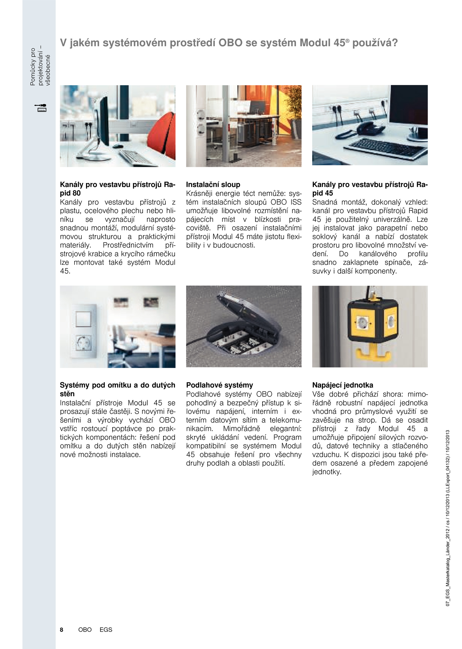 Pomůcky pro projektování. Systémy Modul 45, zásuvky. Systémy Modul. connect, zásuvky a příslušenství pro instalaci. Systémy Modul 45, spínací a připojovací přístroje. Systémy Modul 45, řešení datové techniky. Systémy Modul 45, multimediální řešení. Systémy Modul 45, řešení vestavby přístrojů pod a na omítku. Systémy Modul 45, řešení vestavby přístrojů pro systémy Rapid 80 a ISS. Systémy pro pracoviště, jednotky Deskbox a ohebný kanál. Systémy pro pracoviště, systém IAS. Průmyslové systémy a systémy speciálních zásuvkových zařízení. Systémy rozvodu energie ...