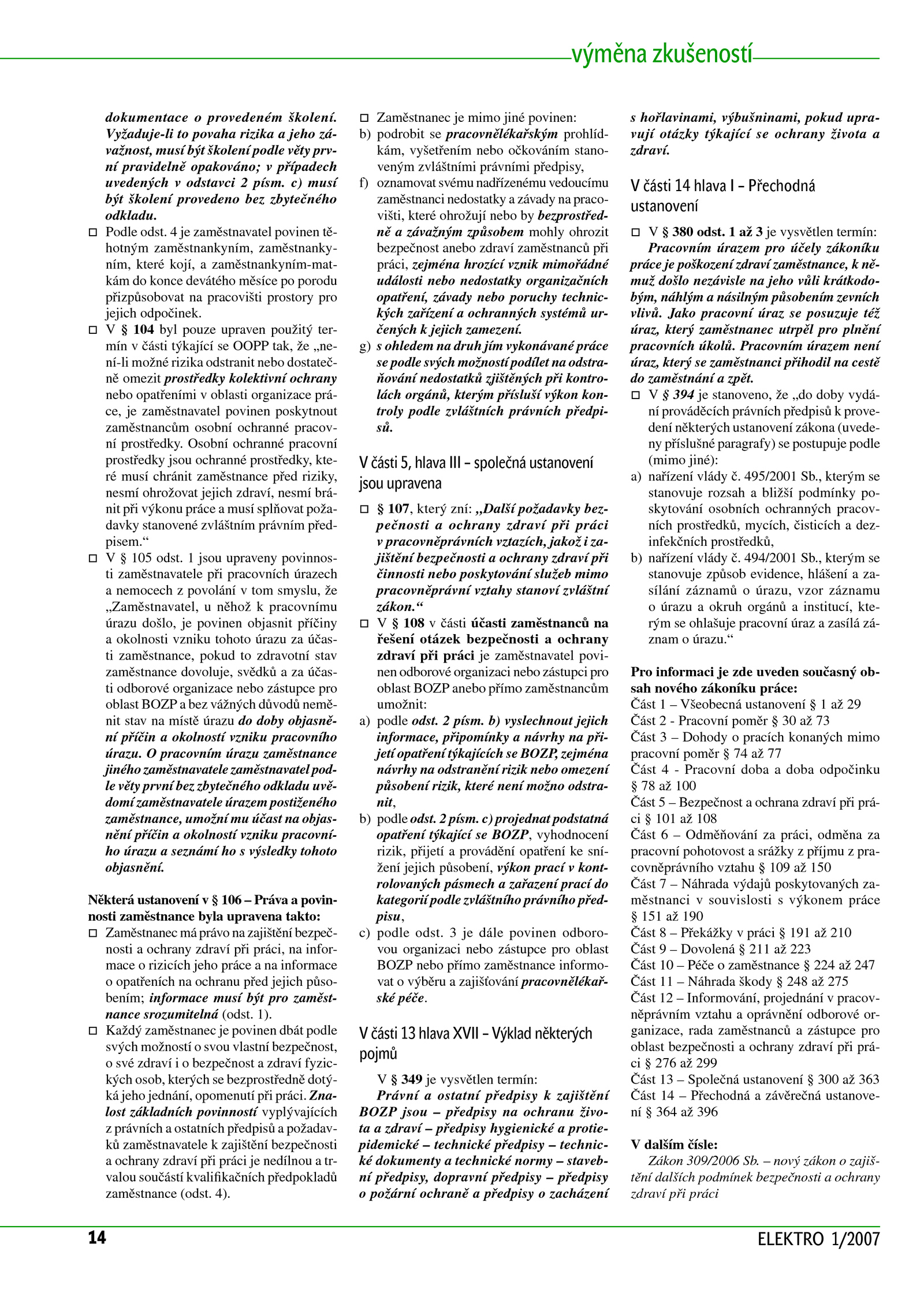 Pro informaci zde uveden současný obsah nového zákoníku práce: Část Všeobecná ustanovení Část Pracovní poměr Část Dohody pracích konaných mimo pracovní poměr Část Pracovní doba doba odpočinku 100 Část Bezpečnost ochrana zdraví při práci 101 108 Část Odměňování práci, odměna pracovní pohotovost srážky příjmu pracovněprávního vztahu 109 150 Část Náhrada výdajů poskytovaných zaměstnanci souvislosti výkonem práce 151 190 Část Překážky práci 191 210 Část Dovolená 211 223 Část Péče zaměstnance 224 247 Část Náhrada škody 248 275 Část Informování, projednání pracovněprávním vztahu oprávnění odborové organizace, rada zaměstnanců zástupce pro oblast bezpečnosti ochrany zdraví při práci 276 299 Část Společná ustanovení 300 363 Část Přechodná závěrečná ustanovení 364 396 dalším čísle: Zákon 309/2006 Sb. 1). písm. Každý zaměstnanec povinen dbát podle svých možností svou vlastní bezpečnost, své zdraví bezpečnost zdraví fyzických osob, kterých bezprostředně dotýká jeho jednání, opomenutí při práci.“ 105 odst. Podle odst.“ 108 části účasti zaměstnanců řešení otázek bezpečnosti ochrany zdraví při práci zaměstnavatel povinen odborové organizaci nebo zástupci pro oblast BOZP anebo přímo zaměstnancům umožnit: podle odst.výměna zkušeností