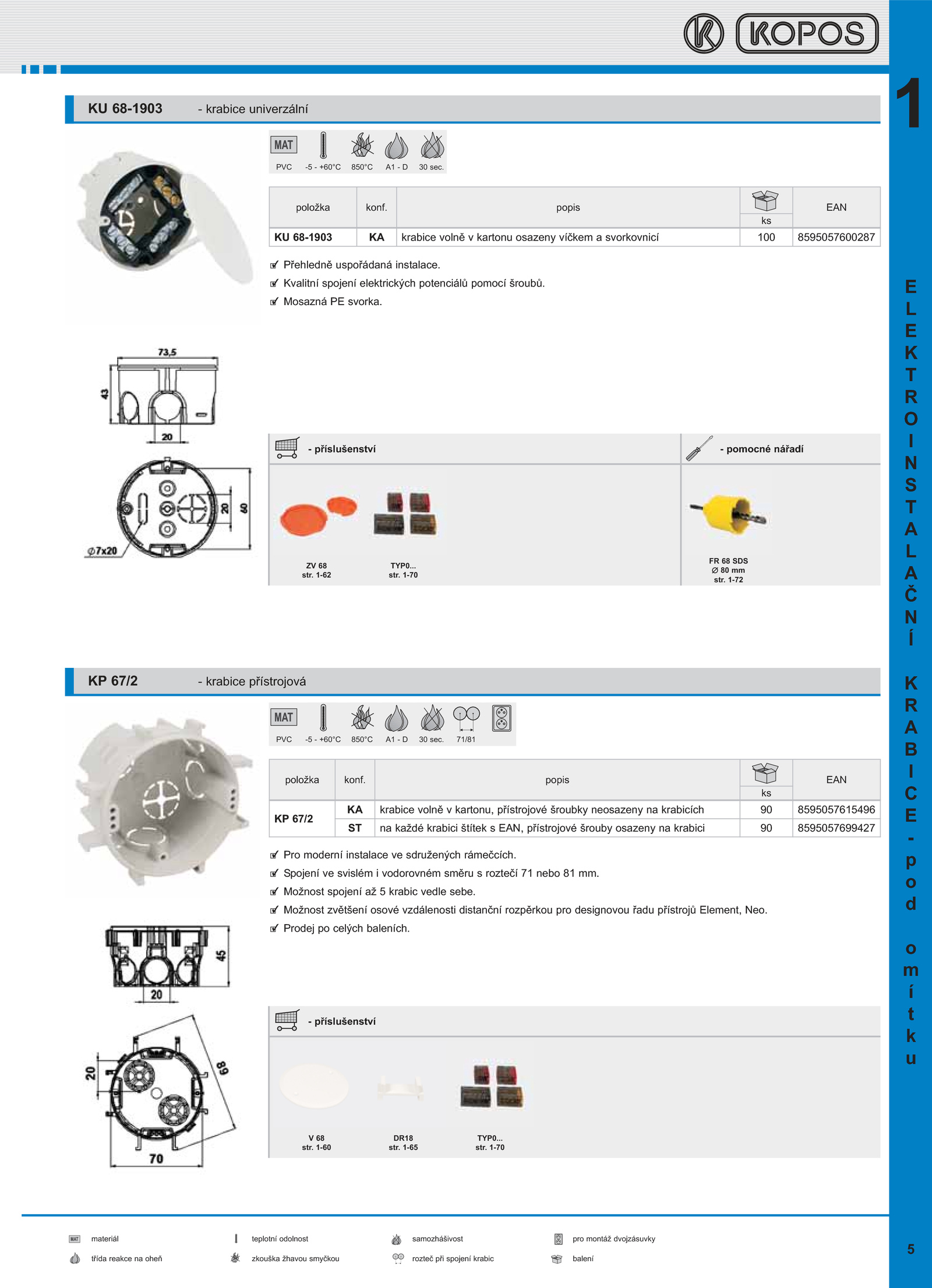 popis EAN ks KP 67/2 KA krabice volně kartonu, přístrojové šroubky neosazeny krabicích 8595057615496 ST každé krabici štítek EAN, přístrojové šrouby osazeny krabici 8595057699427  Pro moderní instalace sdružených rámečcích. 1-70 FR SDS ∅ mm str.  Spojení svislém vodorovném směru roztečí nebo mm. 71/81 V 68 str. 1-62 TYP0. str.  Možnost zvětšení osové vzdálenosti distanční rozpěrkou pro designovou řadu přístrojů Element, Neo.1 E L E K T R O I N S T A L A Č N Í K R A B I C E - p o d o m í t k u 5 materiál teplotní odolnost samozhášivost pro montáž dvojzásuvky třída reakce oheň zkouška žhavou smyčkou rozteč při spojení krabic balení KU 68-1903 krabice univerzální položka konf. popis EAN ks KU 68-1903 krabice volně kartonu osazeny víčkem svorkovnicí 100 8595057600287  Přehledně uspořádaná instalace.. 1-70 A1 DPVC +60°C 850°C sec. 1-60 DR18 str. 1-65 - příslušenství TYP0..  Mosazná svorka..  Prodej celých baleních.. ZV 68 str.  Možnost spojení krabic vedle sebe. . str. 1-72 - příslušenství pomocné nářadí A1 DPVC +60°C 850°C sec.  Kvalitní spojení elektrických potenciálů pomocí šroubů. KP 67/2 krabice přístrojová položka konf