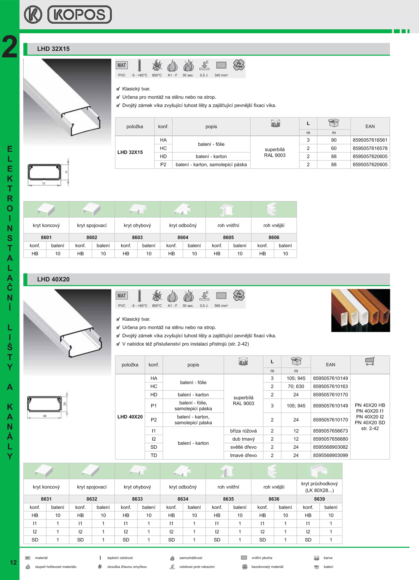 balení konf.2 E L E K T R O I N S T A L A Č N Í L I Š T Y A K A N Á L Y 12 materiál teplotní odolnost samozhášivost vnitřní plocha barva stupeň hořlavosti materiálu zkouška žhavou smyčkou odolnost proti nárazům bezolovnatý materiál balení LHD 32X15  Klasický tvar.PVC +60°C 0,5 340 mm2 850°C LHD 40X20  Klasický tvar. balení konf. balení konf. balení konf. balení konf. balení konf. popis L EAN m m LHD 32X15 HA balení fólie superbílá RAL 9003 3 8595057616561 HC 8595057616578 HD balení karton 8595057620605 P2 balení karton, samolepicí páska 8595057620605 30 sec.. balení HB 10 kryt koncový kryt spojovací kryt ohybový kryt odbočný roh vnitřní roh vnější kryt průchodkový (LK 80X28. popis L EAN m m LHD 40X20 HA balení fólie superbílá RAL 9003 3 105; 945 8595057610149 PN 40X20 HB PN 40X20 I1 PN 40X20 I2 PN 40X20 SD str. balení konf. balení konf. 2-42) položka konf.  Určena pro montáž stěnu nebo strop.. balení konf.  nabídce též příslušenství pro instalaci přístrojů (str.  Určena pro montáž stěnu nebo strop.PVC +60°C 0,5 560 mm2 850°C kryt koncový kryt spojovací kryt ohybový kryt odbočný roh vnitřní roh vnější 8601 8602 8603 8604 8605 8606 konf. balení konf. položka konf. balení HB 10 I1 1 I2 1 SD.) 8631 8632 8633 8634 8635 8636 8639 konf.  Dvojitý zámek víka zvyšující tuhost lišty zajišťující pevnější fixaci víka.  Dvojitý zámek víka zvyšující tuhost lišty zajišťující pevnější fixaci víka. balení konf. 2-42 HC 70; 630 8595057610163 HD balení karton 8595057610170 P1 balení fólie, samolepicí páska 3 105; 945 8595057610149 P2 balení karton, samolepicí páska 2 8595057610170 I1 balení karton bříza růžová 8595057656673 I2 dub tmavý 8595057656680 SD světlé dřevo 8595568903082 TD tmavé dřevo 8595568903099 30 sec
