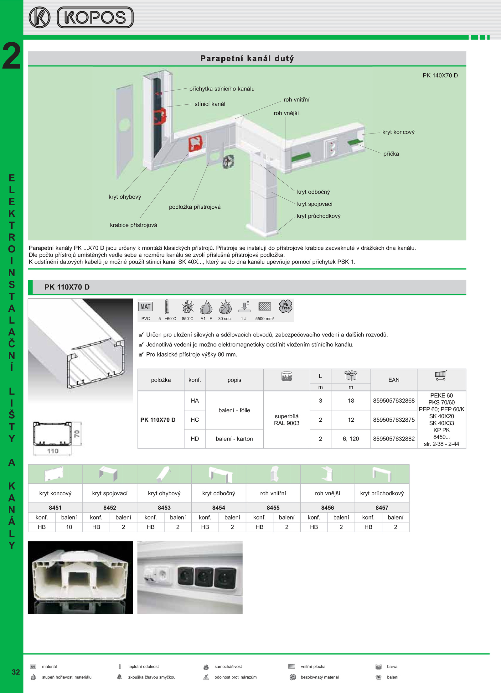 položka konf. balení konf. Přístroje instalují přístrojové krabice zacvaknuté drážkách dna kanálu.. K odstínění datových kabelů možné použít stínicí kanál 40X... kryt koncový kryt spojovací kryt ohybový kryt odbočný roh vnitřní roh vnější kryt průchodkový 8451 8452 8453 8454 8455 8456 8457 konf.  Pro klasické přístroje výšky mm.2 E L E K T R O I N S T A L A Č N Í L I Š T Y A K A N Á L Y 32 materiál teplotní odolnost samozhášivost vnitřní plocha barva stupeň hořlavosti materiálu zkouška žhavou smyčkou odolnost proti nárazům bezolovnatý materiál balení Parapetní kanál dutý stínicí kanál příchytka stínicího kanálu krabice přístrojová podložka přístrojová kryt koncový kryt spojovací kryt průchodkový kryt ohybový příčka kryt odbočný roh vnitřní roh vnější PK 140X70 D PK 110X70 D  Určen pro uložení silových sdělovacích obvodů, zabezpečovacího vedení dalších rozvodů., který dna kanálu upevňuje pomocí příchytek PSK 1. balení konf.. balení konf.X70 jsou určeny montáži klasických přístrojů. balení konf.  Jednotlivá vedení možno elektromagneticky odstínit vložením stínícího kanálu. 2-38 2-44 HC 8595057632875 HD balení karton 120 8595057632882 30 sec. balení konf... Dle počtu přístrojů umístěných vedle sebe rozměru kanálu zvolí příslušná přístrojová podložka. balení HB. balení konf. popis L EAN m m PK 110X70 D HA balení fólie superbílá RAL 9003 3 8595057632868 PEKE 60 PKS 70/60 PEP 60; PEP 60/K SK 40X20 SK 40X33 KP PK 8450.PVC +60°C 5500 mm2 850°C Parapetní kanály . str