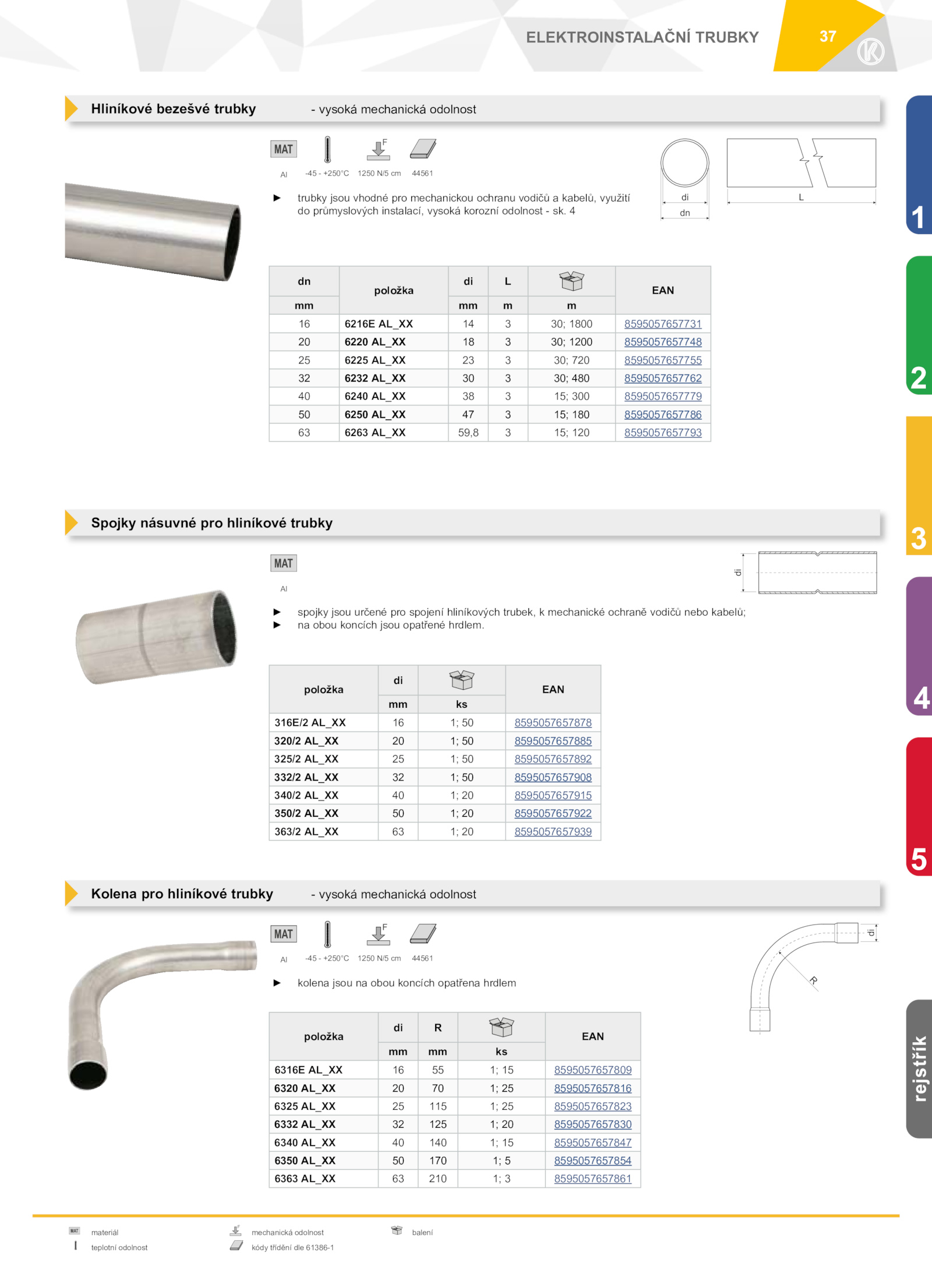 4 dn položka di L EAN mm m 16 6216E AL_XX 30; 1800 8595057657731 20 6220 AL_XX 30; 1200 8595057657748 25 6225 AL_XX 30; 720 8595057657755 32 6232 AL_XX 30; 480 8595057657762 40 6240 AL_XX 15; 300 8595057657779 50 6250 AL_XX 15; 180 8595057657786 63 6263 AL_XX 59,8 15; 120 8595057657793 Al -45 +250°C 1250 N/5 44561 Kolena pro hliníkové trubky vysoká mechanická odolnost položka di R EAN mm ks 6316E AL_XX 8595057657809 6320 AL_XX 8595057657816 6325 AL_XX 115 8595057657823 6332 AL_XX 125 8595057657830 6340 AL_XX 140 8595057657847 6350 AL_XX 170 8595057657854 6363 AL_XX 210 8595057657861 Al -45 +250°C 1250 N/5 44561 Spojky násuvné pro hliníkové trubky položka di EAN mm ks 316E/2 AL_XX 8595057657878 320/2 AL_XX 8595057657885 325/2 AL_XX 8595057657892 332/2 AL_XX 8595057657908 340/2 AL_XX 8595057657915 350/2 AL_XX 8595057657922 363/2 AL_XX 8595057657939 Al ► spojky jsou určené pro spojení hliníkových trubek, mechanické ochraně vodičů nebo kabelů; ► na obou koncích jsou opatřené hrdlem. ► kolena jsou obou koncích opatřena hrdlem 2 1 4 5 rejstřík .37 ELEKTROINSTALAČNÍ TRUBKY 3 materiál mechanická odolnost balení teplotní odolnost kódy třídění dle 61386-1 Hliníkové bezešvé trubky vysoká mechanická odolnost ► trubky jsou vhodné pro mechanickou ochranu vodičů kabelů, využití do průmyslových instalací, vysoká korozní odolnost sk