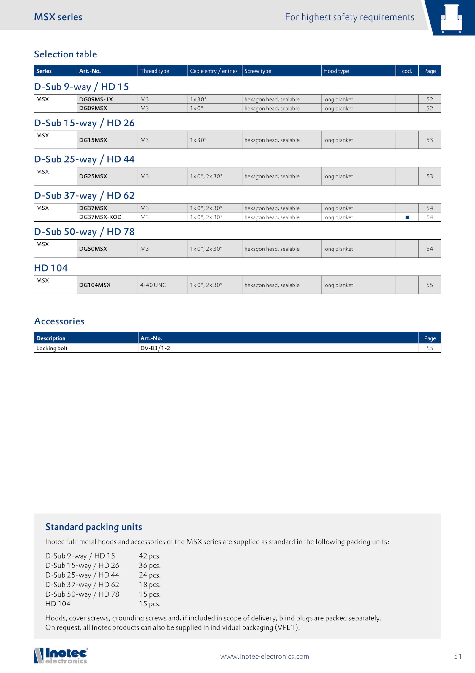 Inotec full-metal hoods and accessories the MSX series are supplied standard the following packing units:
