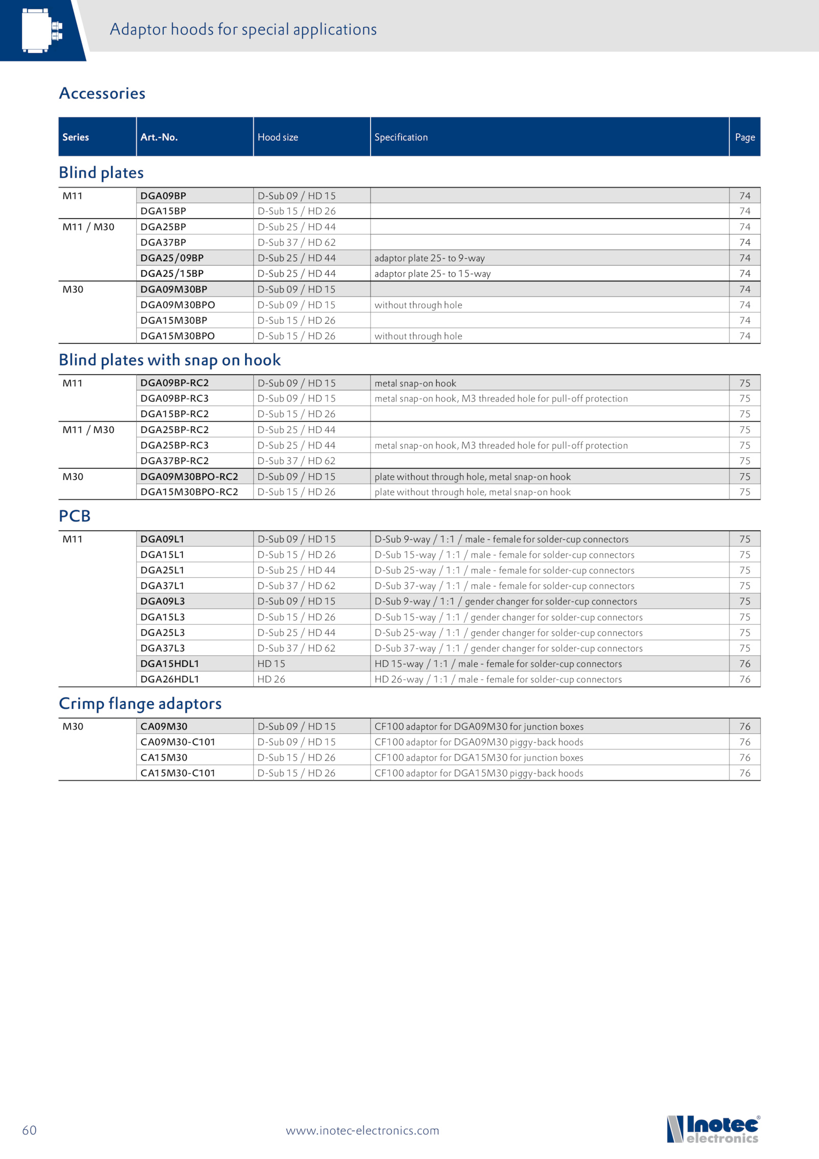 com Accessories Series Art.www.-No.inotec-electronics. Hood size Specification Page Blind plates M11 DGA09BP D-Sub 74 DGA15BP D-Sub 74 M11 M30 DGA25BP D-Sub 74 DGA37BP D-Sub 74 DGA25/09BP D-Sub adaptor plate 25- 9-way 74 DGA25/15BP D-Sub adaptor plate 25- 15-way 74 M30 DGA09M30BP D-Sub 74 DGA09M30BPO D-Sub without through hole 74 DGA15M30BP D-Sub 74 DGA15M30BPO D-Sub without through hole 74 Blind plates with snap hook M11 DGA09BP-RC2 D-Sub metal snap-on hook 75 DGA09BP-RC3 D-Sub metal snap-on hook, threaded hole for pull-off protection 75 DGA15BP-RC2 D-Sub 75 M11 M30 DGA25BP-RC2 D-Sub 75 DGA25BP-RC3 D-Sub metal snap-on hook, threaded hole for pull-off protection 75 DGA37BP-RC2 D-Sub 75 M30 DGA09M30BPO-RC2 D-Sub plate without through hole, metal snap-on hook 75 DGA15M30BPO-RC2 D-Sub plate without through hole, metal snap-on hook 75 PCB M11 DGA09L1 D-Sub D-Sub 9-way 1:1 male female for solder-cup connectors 75 DGA15L1 D-Sub D-Sub 15-way 1:1 male female for solder-cup connectors 75 DGA25L1 D-Sub D-Sub 25-way 1:1 male female for solder-cup connectors 75 DGA37L1 D-Sub D-Sub 37-way 1:1 male female for solder-cup connectors 75 DGA09L3 D-Sub D-Sub 9-way 1:1 gender changer for solder-cup connectors 75 DGA15L3 D-Sub D-Sub 15-way 1:1 gender changer for solder-cup connectors 75 DGA25L3 D-Sub D-Sub 25-way 1:1 gender changer for solder-cup connectors 75 DGA37L3 D-Sub D-Sub 37-way 1:1 gender changer for solder-cup connectors 75 DGA15HDL1 15-way 1:1 male female for solder-cup connectors 76 DGA26HDL1 26-way 1:1 male female for solder-cup connectors 76 Crimp flange adaptors M30 CA09M30 D-Sub CF100 adaptor for DGA09M30 for junction boxes 76 CA09M30-C101 D-Sub CF100 adaptor for DGA09M30 piggy-back hoods 76 CA15M30 D-Sub CF100 adaptor for DGA15M30 for junction boxes 76 CA15M30-C101 D-Sub CF100 adaptor for DGA15M30 piggy-back hoods 76 Adaptor hoods for special applications