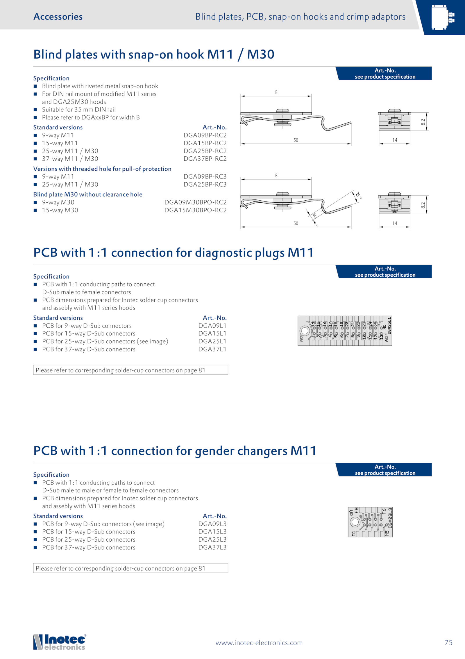 14 B 50 1 5 ° M 3 8. see product specification Specification PCB with 1:1 conducting paths connect D-Sub male female connectors PCB dimensions prepared for Inotec solder cup connectors and assebly with M11 series hoods Standard versions Art.-No. PCB for 9-way D-Sub connectors DGA09L1 PCB for 15-way D-Sub connectors DGA15L1 PCB for 25-way D-Sub connectors (see image) DGA25L1 PCB for 37-way D-Sub connectors DGA37L1 Please refer corresponding solder-cup connectors page 81 Specification PCB with 1:1 conducting paths connect D-Sub male male female female connectors PCB dimensions prepared for Inotec solder cup connectors and assebly with M11 series hoods Standard versions Art. see product specification Specification Blind plate with riveted metal snap-on hook For DIN rail mount modified M11 series and DGA25M30 hoods Suitable for DIN rail Please refer DGAxxBP for width B Standard versions Art.-No.com Art. see product specification Art.2 75 www.-No.inotec-electronics. PCB for 9-way D-Sub connectors (see image) DGA09L3 PCB for 15-way D-Sub connectors DGA15L3 PCB for 25-way D-Sub connectors DGA25L3 PCB for 37-way D-Sub connectors DGA37L3 Please refer corresponding solder-cup connectors page 81 PCB with 1:1 connection for diagnostic plugs M11 PCB with 1:1 connection for gender changers M11 Art.-No.2 14 B 50 8.-No.-No. 9-way M11 DGA09BP-RC2 15-way M11 DGA15BP-RC2 25-way M11 M30 DGA25BP-RC2 37-way M11 M30 DGA37BP-RC2 Versions with threaded hole for pull-of protection 9-way M11 DGA09BP-RC3 25-way M11 M30 DGA25BP-RC3 Blind plate M30 without clearance hole 9-way M30 DGA09M30BPO-RC2 15-way M30 DGA15M30BPO-RC2 Blind plates with snap-on hook M11 M30 Accessories Blind plates, PCB, snap-on hooks and crimp adaptors