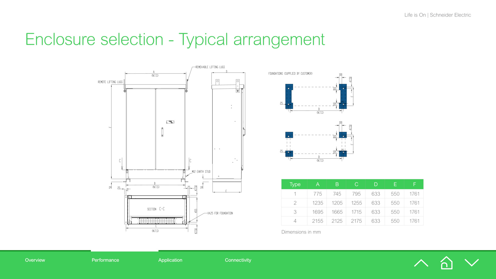 Life Schneider Electric Type F 1 775 745 795 633 550 1761 2 1235 1205 1255 633 550 1761 3 1695 1665 1715 633 550 1761 4 2155 2125 2175 633 550 1761 Enclosure selection Typical arrangement Dimensions mm Application Performance Overview Connectivity