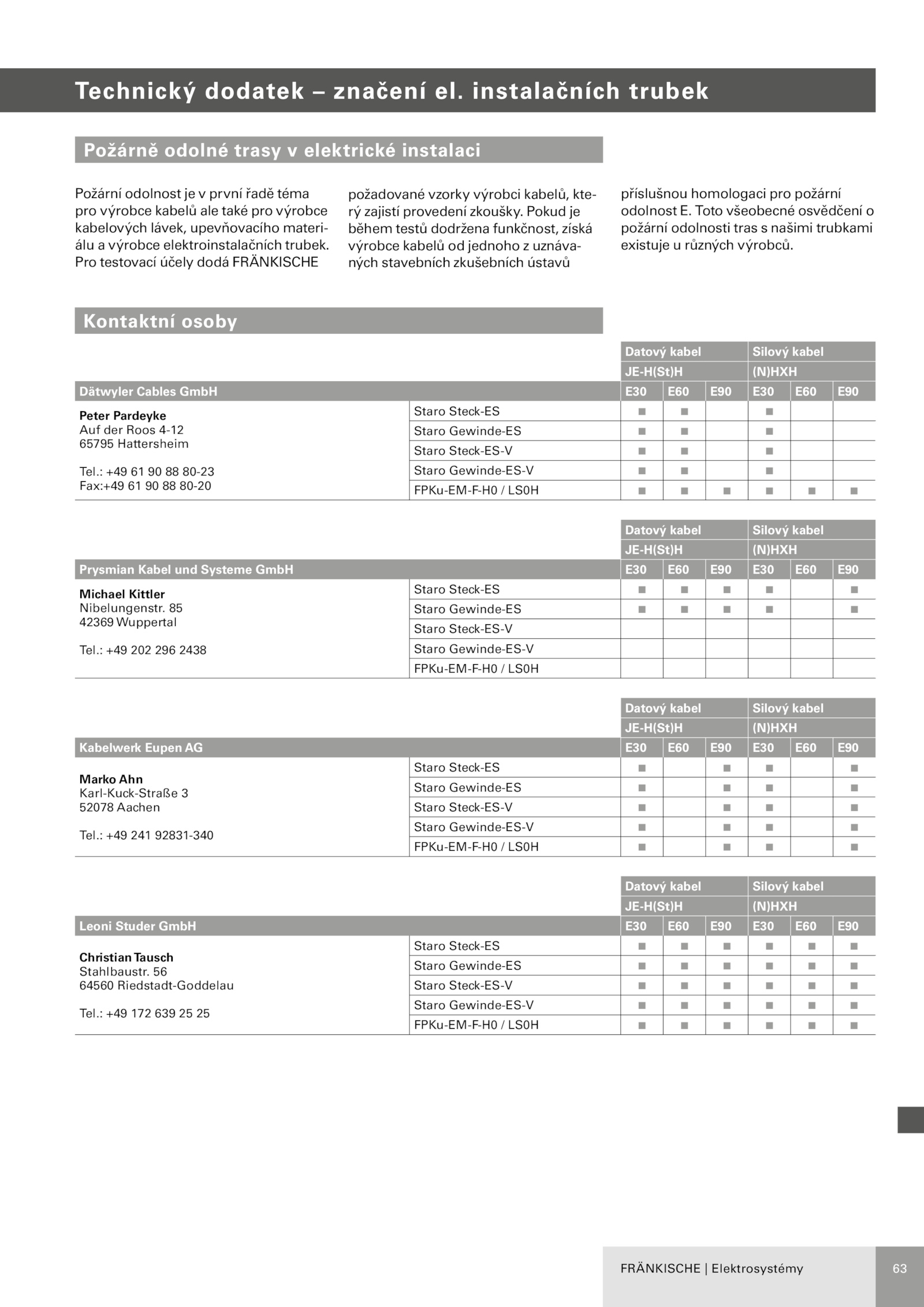 Pro testovací účely dodá FRÄNKISCHE požadované vzorky výrobci kabelů, kte- rý zajistí provedení zkoušky.Technický dodatek značení el.: +49 172 639 25 Staro Steck-ES ■ Staro Gewinde-ES ■ Staro Steck-ES-V ■ Staro Gewinde-ES-V ■ FPKu-EM-F-H0 LS0H ■ 63 FRÄNKISCHE Elektrosystémy . instalačních trubek Požárně odolné trasy elektrické instalaci Požární odolnost první řadě téma pro výrobce kabelů ale také pro výrobce kabelových lávek, upevňovacího materi- álu výrobce elektroinstalačních trubek. Kontaktní osoby Datový kabel Silový kabel JE-H(St)H (N)HXH Dätwyler Cables GmbH E30 E60 E90 E30 E60 E90 Peter Pardeyke Auf der Roos 4-12 65795 Hattersheim Tel. Pokud je během testů dodržena funkčnost, získá výrobce kabelů jednoho uznáva- ných stavebních zkušebních ústavů příslušnou homologaci pro požární odolnost Toto všeobecné osvědčení o požární odolnosti tras našimi trubkami existuje různých výrobců.: +49 80-23 Fax:+49 80-20 Staro Steck-ES ■ Staro Gewinde-ES ■ Staro Steck-ES-V ■ Staro Gewinde-ES-V ■ FPKu-EM-F-H0 LS0H ■ Datový kabel Silový kabel JE-H(St)H (N)HXH Prysmian Kabel und Systeme GmbH E30 E60 E90 E30 E60 E90 Michael Kittler Nibelungenstr.: +49 202 296 2438 Staro Steck-ES ■ Staro Gewinde-ES ■ Staro Steck-ES-V Staro Gewinde-ES-V FPKu-EM-F-H0 LS0H Datový kabel Silový kabel JE-H(St)H (N)HXH Kabelwerk Eupen E30 E60 E90 E30 E60 E90 Marko Ahn Karl-Kuck-Straße 3 52078 Aachen Tel. 85 42369 Wuppertal Tel.: +49 241 92831-340 Staro Steck-ES ■ Staro Gewinde-ES ■ Staro Steck-ES-V ■ Staro Gewinde-ES-V ■ FPKu-EM-F-H0 LS0H ■ Datový kabel Silový kabel JE-H(St)H (N)HXH Leoni Studer GmbH E30 E60 E90 E30 E60 E90 ChristianTausch Stahlbaustr. 56 64560 Riedstadt-Goddelau Tel